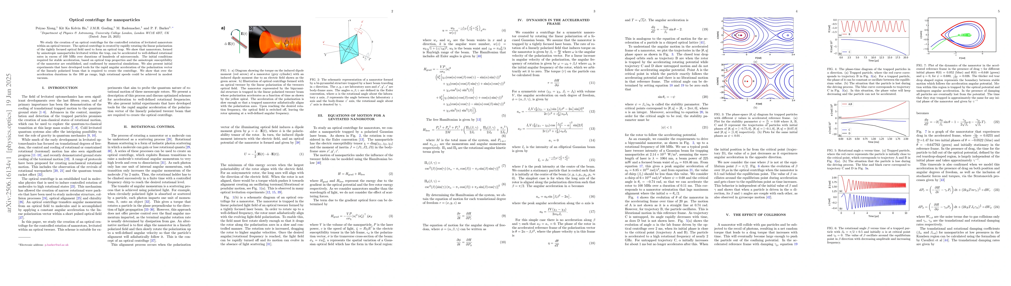 We study the creation of an optical centrifuge for the controlled rotation of levitated nanorotors within an optical tweezer. The optical centrifuge is created by rapidly rotating the linear polarization of the tightly focused optical field used to form an optical trap. We show that nanorotors, formed by anisotropic nanoparticles levitated within the trap, can be accelerated to well-defined rotational rates in excess of 100 MHz over durations of hundreds of microseconds. The initial conditions required for stable acceleration, based on optical trap properties and the anisotropic susceptibility of the nanorotor are established, and confirmed by numerical simulations. We also present initial experiments that have developed tools for the rapid angular acceleration of the polarization vector of the linearly polarized beam that is required to create the centrifuge. We show that over the acceleration durations in the 100 $\upmu$s range, high rotational speeds could be achieved in modest vacuum.