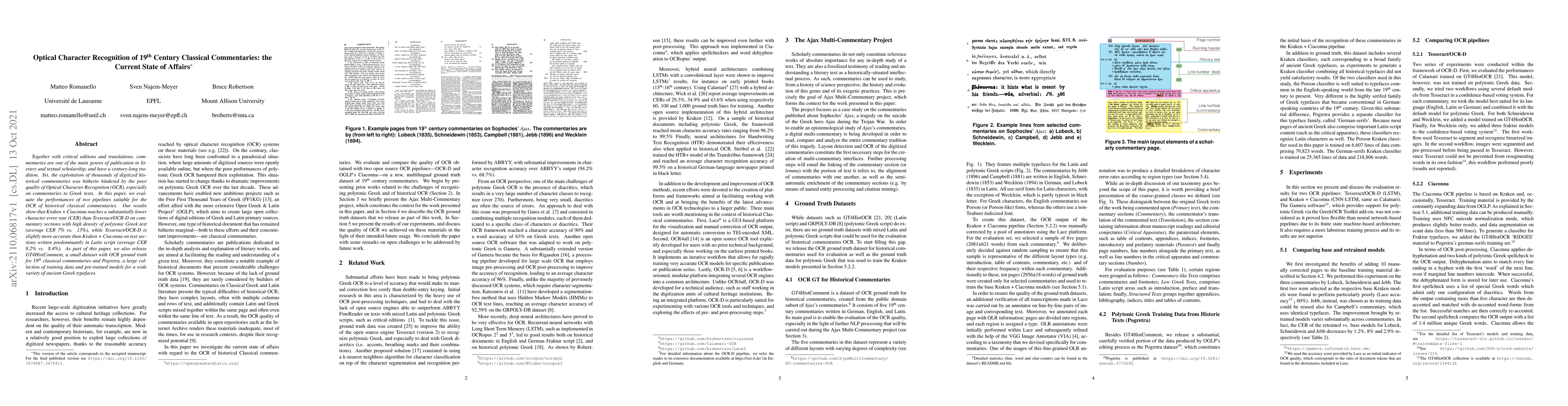 This paper evaluates OCR pipelines for 19th century classical commentaries, finding Kraken + Ciaconna better for polytonic Greek text (average CER 7%) and Tesseract/OCR-D slightly better for Latin script (average CER 8.2%). The study also releases GT4HistComment and Pogretra for further research.