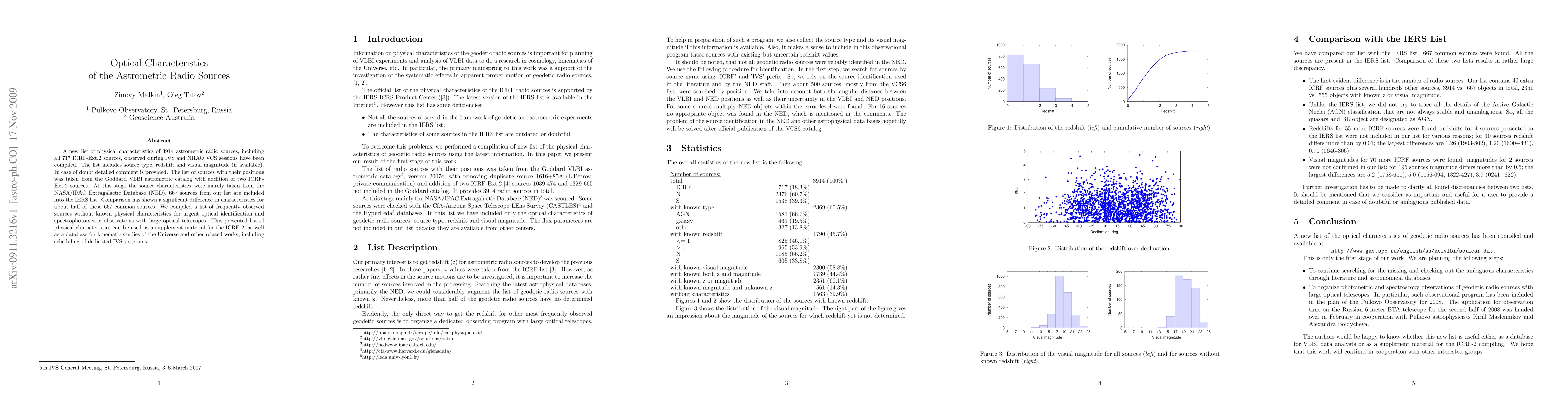 This paper compiles the physical characteristics of 3914 astrometric radio sources, including detailed comments on uncertain data, and highlights significant differences in characteristics for half of the 667 common sources compared to the IERS list. It also identifies sources needing urgent optical identification for further study.