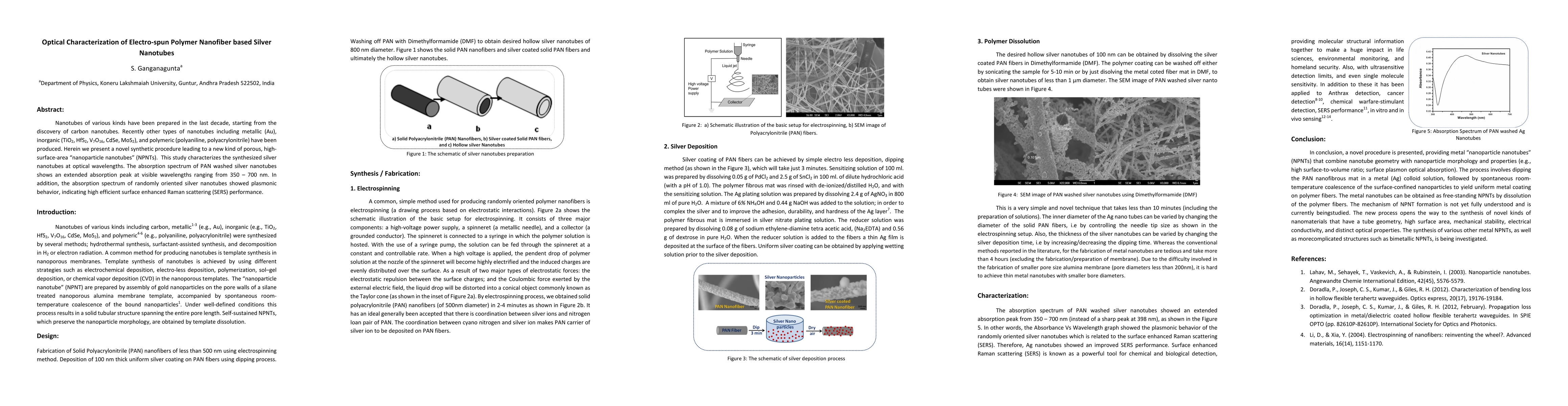 Nanotubes of various kinds have been prepared in the last decade, starting from the discovery of carbon nanotubes. Recently other types of nanotubes including metallic (Au), inorganic (TiO2, HfS2, V7O16, CdSe, MoS2), and polymeric (polyaniline, polyacrylonitrile) have been produced. Herein we present a novel synthetic procedure leading to a new kind of porous, high-surface-area nanoparticle nanotubes (NPNTs). This study characterizes the synthesized silver nanotubes at optical wavelengths. The absorption spectrum of PAN washed silver nanotubes shows an extended absorption peak at visible wavelengths ranging from 350 to 700 nm. In addition, the absorption spectrum of randomly oriented silver nanotubes showed plasmonic behavior, indicating high efficient surface enhanced Raman scattering (SERS) performance.