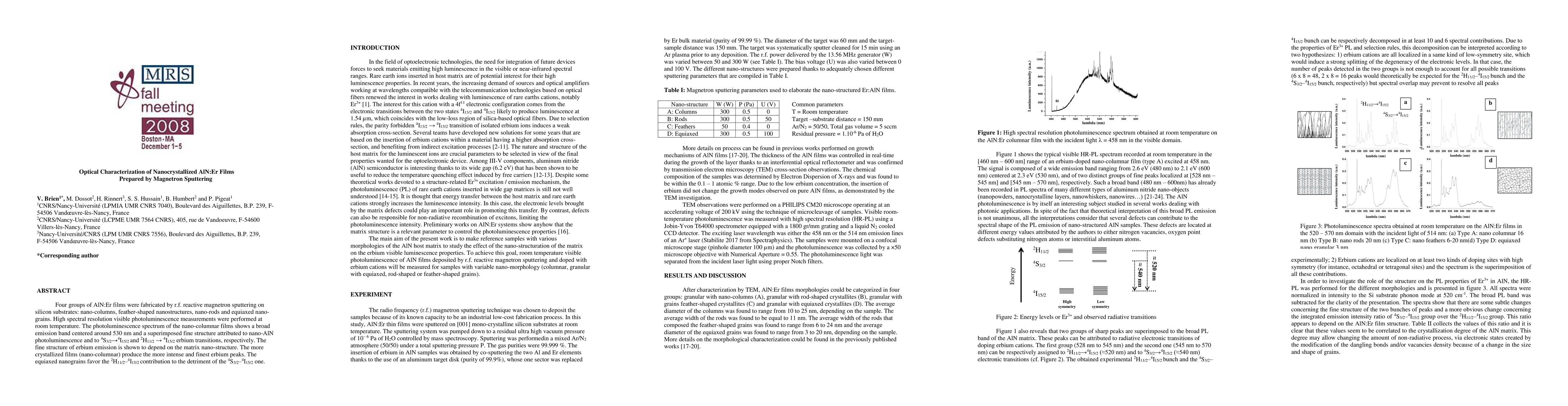 In the prospect of understanding the photoluminescence mechanisms of AlN films doped with erbium and targeting photonic applications we have synthesized non doped and Er-doped AlN films with different crystallized nanostructures by using PVD magnetron sputtering. Their crystalline morphology and their visible photoluminescence properties were precisely measured.Due to the weak cross-section absorption of rare earths like erbium, it is necessary to obtain an efficient energy transfer mechanism between the host matrix and the rare earth to obtain high luminescence efficiency. Our strategy is then to elaborate some nanostructures that could introduce additional intermediate electronic levels within the gap thanks to the presence of structural defects (point defects, grain boundaries{\ldots}) and could lead to energy transfer from the AlN matrix to the rare earth.Doped and non-doped AlN films were prepared by radio frequency magnetron sputtering by using different experimental conditions that will be detailed. It will notably be shown how a negative polarization of samples during deposition allows obtaining crystalline morphologies ranging from the classical columnar structure to a highly disordered polycrystalline structure with grains of several nanometers (nearly amorphous). The nanostructures of the films could be categorized in three types: 1) type 1 was nanocolumnar (width of column ~ 15 nm), 2) type 2 was made of short columns (width of column ~ 10 nm) and 3) the last type was made of equiaxed nanocrystallites (size of grains ~3-4 nm).High-resolution photoluminescence spectroscopy was performed to characterize their optical behaviour. The samples were excited by the laser wavelengths at 458, 488 or 514 nm. A broad photoluminescence band was observed centred around 520 nm in columnar samples. In the same energy range, the highly resolved spectra also showed several sharp emission peaks. This fine structure could be attributed to erbium transitions. This fine structure tended to disappear going from type 1 to type 3 samples. Indeed, the relative intensity of the peaks decreased and their full width at half maximum increased. This change could be related to the density of defects that increased when the size of the grains decreased. The photoluminescence properties of the films in the visible range will be discussed in relation with their structure.