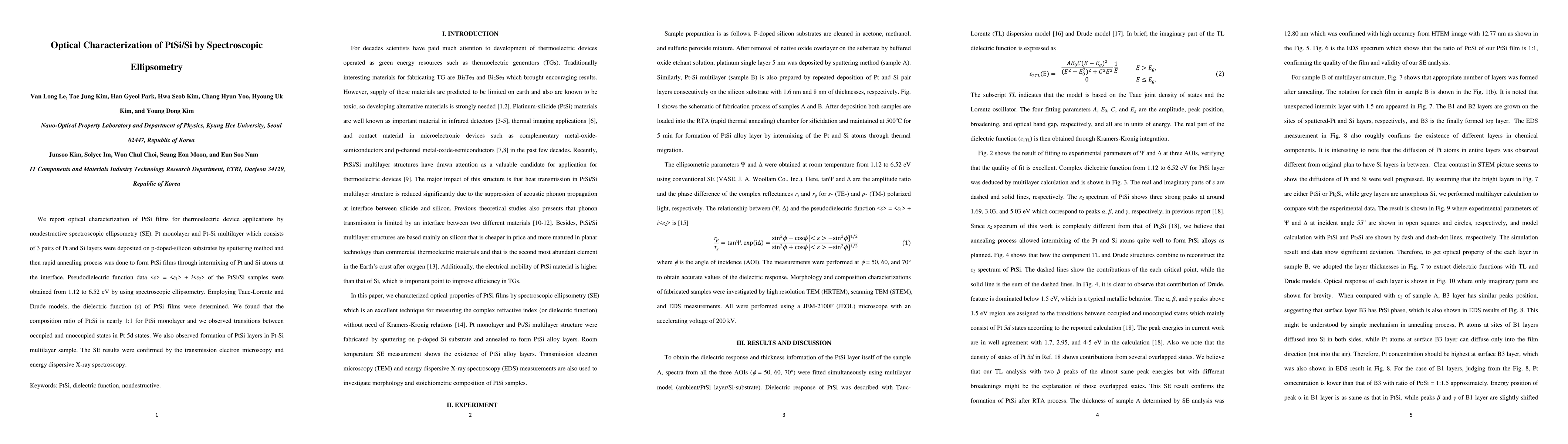 This paper reports on the optical characterization of PtSi films for thermoelectric applications using spectroscopic ellipsometry, revealing a nearly 1:1 Pt:Si composition ratio and transitions in Pt 5d states, confirmed by transmission electron microscopy and energy dispersive X-ray spectroscopy.
