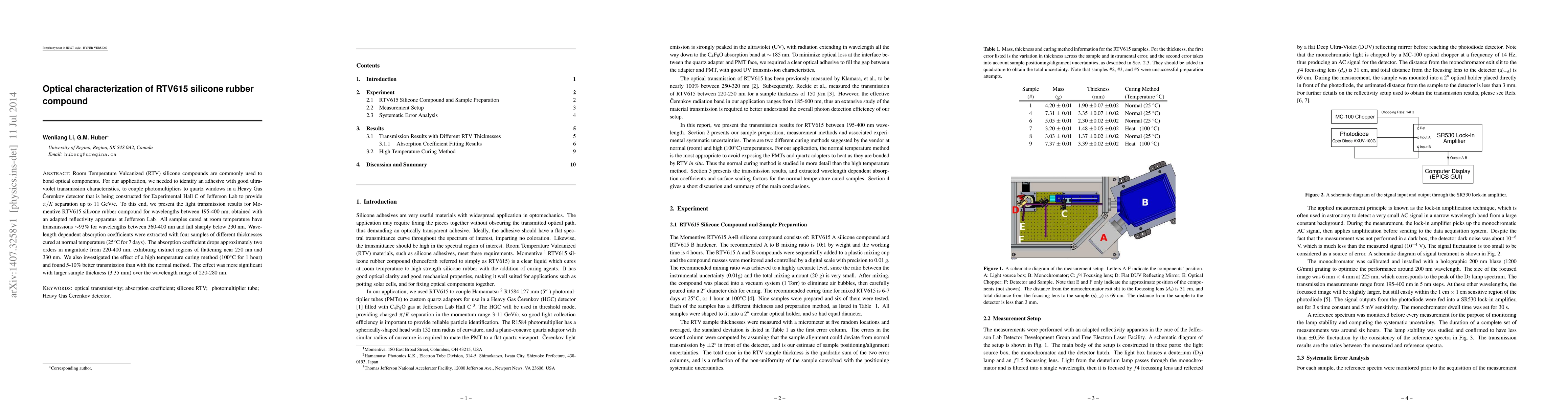 Room Temperature Vulcanized (RTV) silicone compounds are commonly used to bond optical components. For our application, we needed to identify an adhesive with good ultraviolet transmission characteristics, to couple photomultipliers to quartz windows in a Heavy Gas Cerenkov detector that is being constructed for Experimental Hall C of Jefferson Lab to provide pi/K separation up to 11 GeV/c. To this end, we present the light transmission results for Momentive RTV615 silicone rubber compound for wavelengths between 195-400 nm, obtained with an adapted reflectivity apparatus at Jefferson Lab. All samples cured at room temperature have transmissions ~93% for wavelengths between 360-400 nm and fall sharply below 230 nm. Wavelength dependent absorption coefficients were extracted with four samples of different thicknesses cured at normal temperature (25oC for 7 days). The absorption coefficient drops approximately two orders in magnitude from 220-400 nm, exhibiting distinct regions of flattening near 250 nm and 330 nm. We also investigated the effect of a high temperature curing method (100oC for 1 hour) and found 5-10% better transmission than with the normal method. The effect was more significant with larger sample thickness (3.35 mm) over the wavelength range of 220-280 nm.