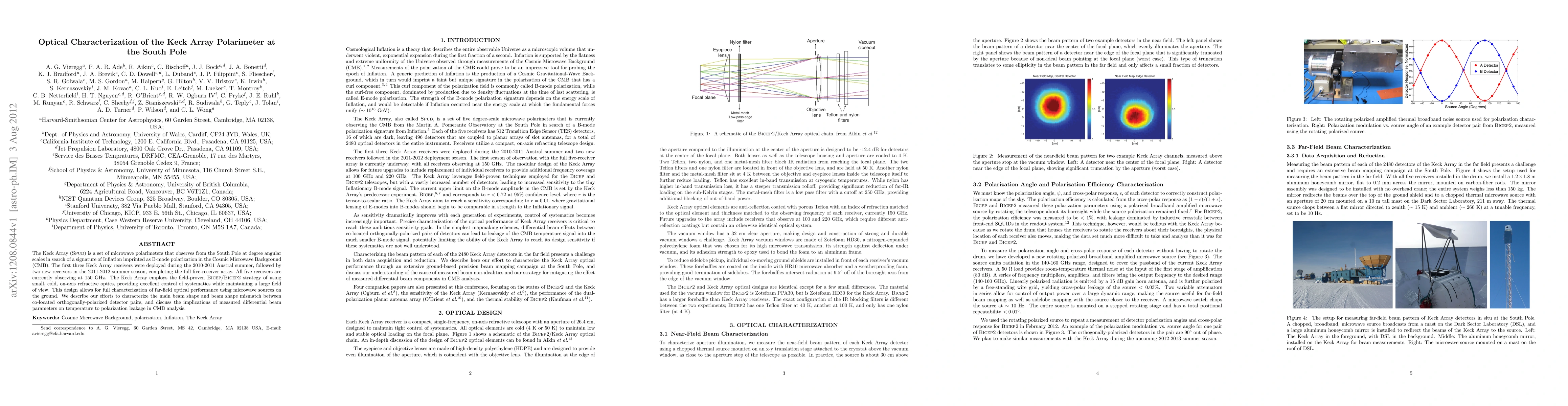 This paper details the optical characterization of the Keck Array polarimeters deployed at the South Pole to detect B-mode polarization in the Cosmic Microwave Background, focusing on beam shape and systematic control, and discusses implications for CMB analysis.