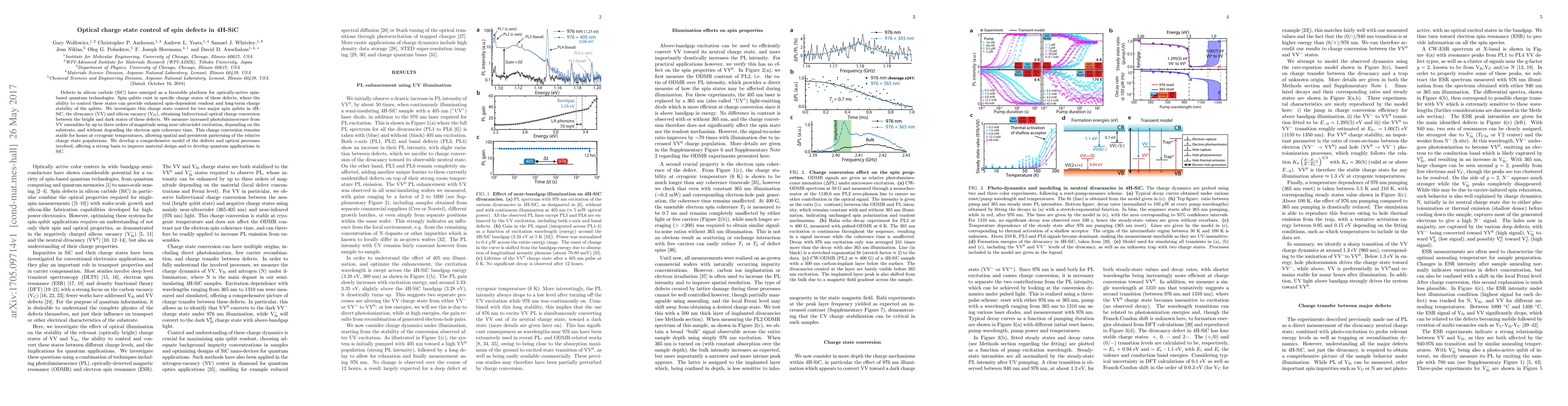 This research explores the optical manipulation of charge states in spin defects in 4H-SiC, specifically the divacancy (VV) and silicon vacancy (Vsi), achieving significant photoluminescence enhancement and stable charge conversion, which promises to improve spin-based quantum technologies.