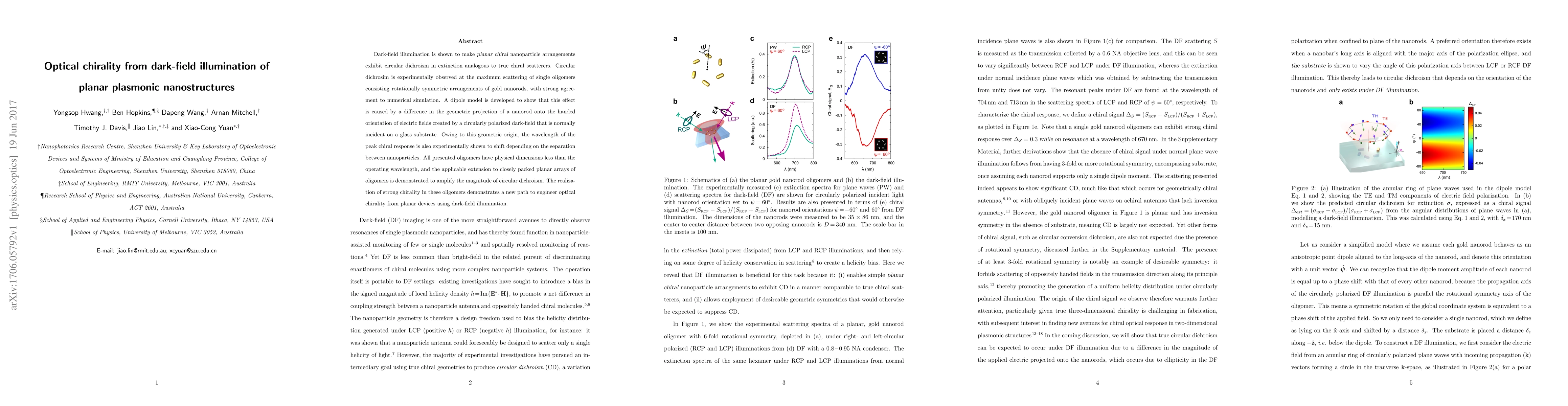 This paper demonstrates that dark-field illumination can induce circular dichroism in planar chiral nanoparticle arrangements, similar to true chiral scatterers. The effect is shown to arise from the geometric projection differences of gold nanorods under circularly polarized light, leading to a shift in the peak chiral response wavelength based on nanoparticle separation.