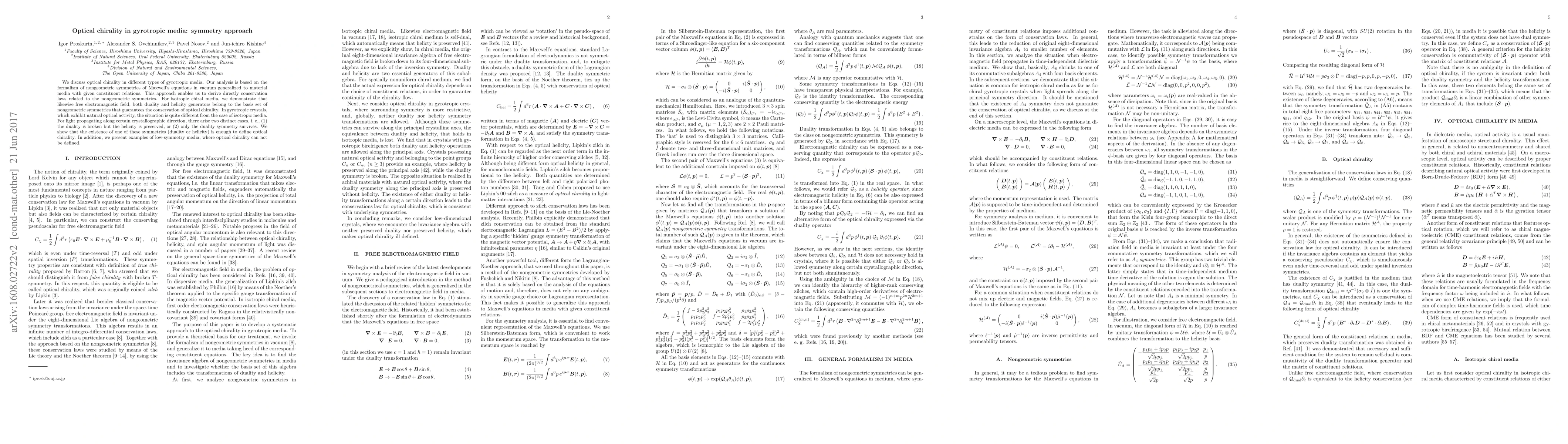 We discuss optical chirality in different types of gyrotropic media. Our analysis is based on the formalism of nongeometric symmetries of Maxwell's equations in vacuum generalized to material media with given constituent relations. This approach enables us to derive directly conservation laws related to the nongeometric symmetries. For isotropic chiral media, we demonstrate that likewise free electromagnetic field, both duality and helicity generators belong to the basis set of nongeometric symmetries that guarantees the conservation of optical chirality. In gyrotropic crystals, which exhibit natural optical activity, the situation is quite different from the case of isotropic media. For light propagating along certain crystallographic direction, there arise two distinct cases, i.~e., (1) the duality is broken but the helicity is preserved, or (2) only the duality symmetry survives. We show that the existence of one of these symmetries (duality or helicity) is enough to define optical chirality. In addition, we present examples of low-symmetry media, where optical chirality can not be defined.