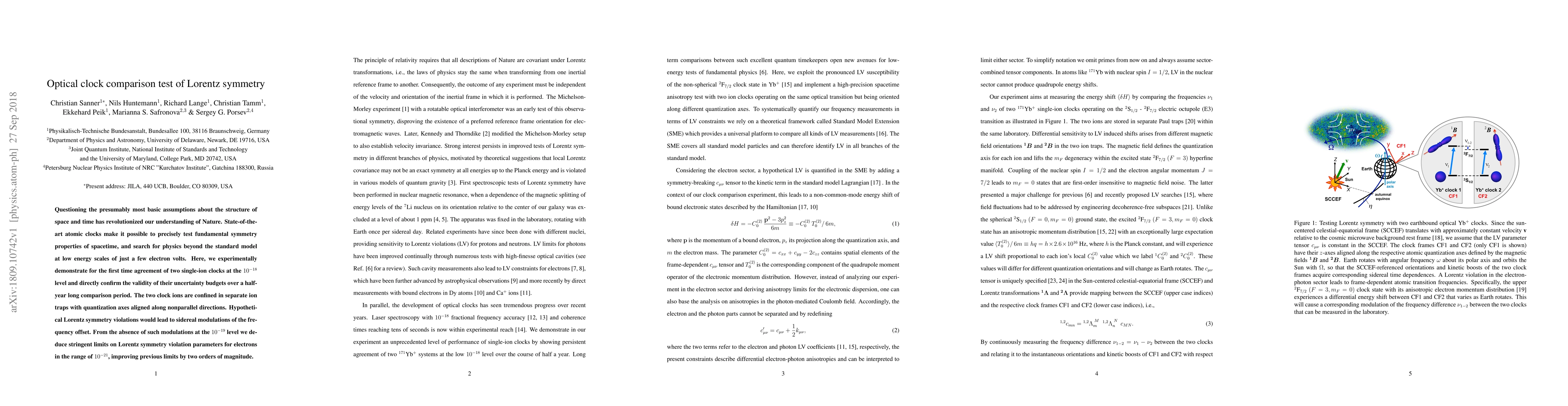 Questioning the presumably most basic assumptions about the structure of space and time has revolutionized our understanding of Nature. State-of-the-art atomic clocks make it possible to precisely test fundamental symmetry properties of spacetime, and search for physics beyond the standard model at low energy scales of just a few electron volts. Here, we experimentally demonstrate for the first time agreement of two single-ion clocks at the $10^{-18}$ level and directly confirm the validity of their uncertainty budgets over a half-year long comparison period. The two clock ions are confined in separate ion traps with quantization axes aligned along nonparallel directions. Hypothetical Lorentz symmetry violations would lead to sidereal modulations of the frequency offset. From the absence of such modulations at the $10^{-19}$ level we deduce stringent limits on Lorentz symmetry violation parameters for electrons in the range of $10^{-21}$, improving previous limits by two orders of magnitude.