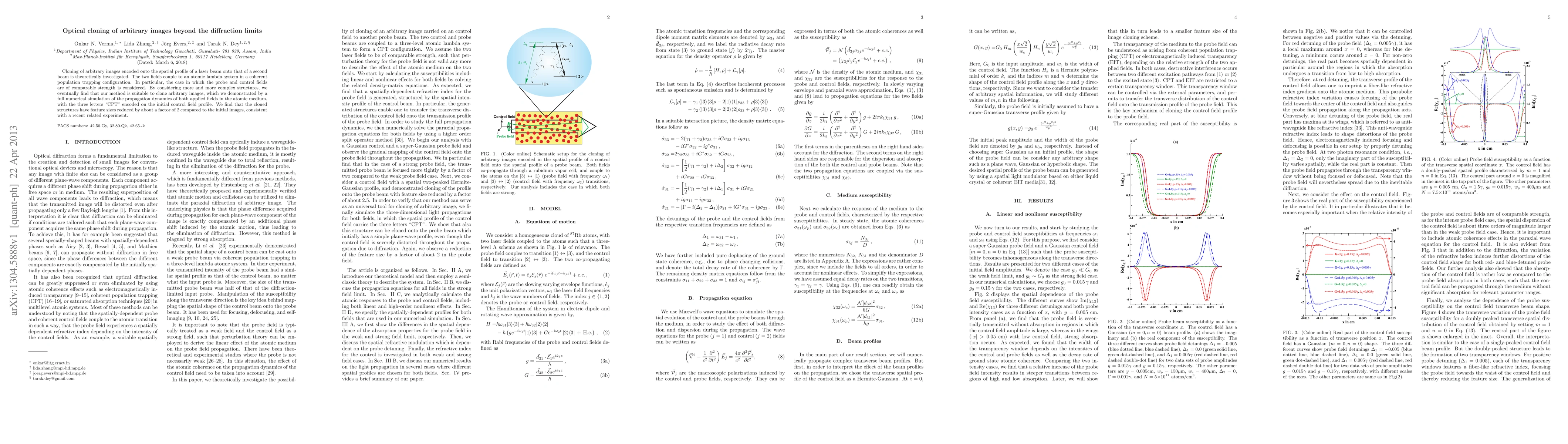 Cloning of arbitrary images encoded onto the spatial profile of a laser beam onto that of a second beam is theoretically investigated. The two fields couple to an atomic lambda system in a coherent population trapping configuration. In particular, the case in which the probe and control fields are of comparable strength is considered. By considering more and more complex structures, we eventually find that our method is suitable to clone arbitrary images, which we demonstrated by a full numerical simulation of the propagation dynamics of both applied fields in the atomic medium, with the three letters "CPT" encoded on the initial control field profile. We find that the cloned structures have feature sizes reduced by about a factor of 2 compared to the initial images, consistent with a recent related experiment.