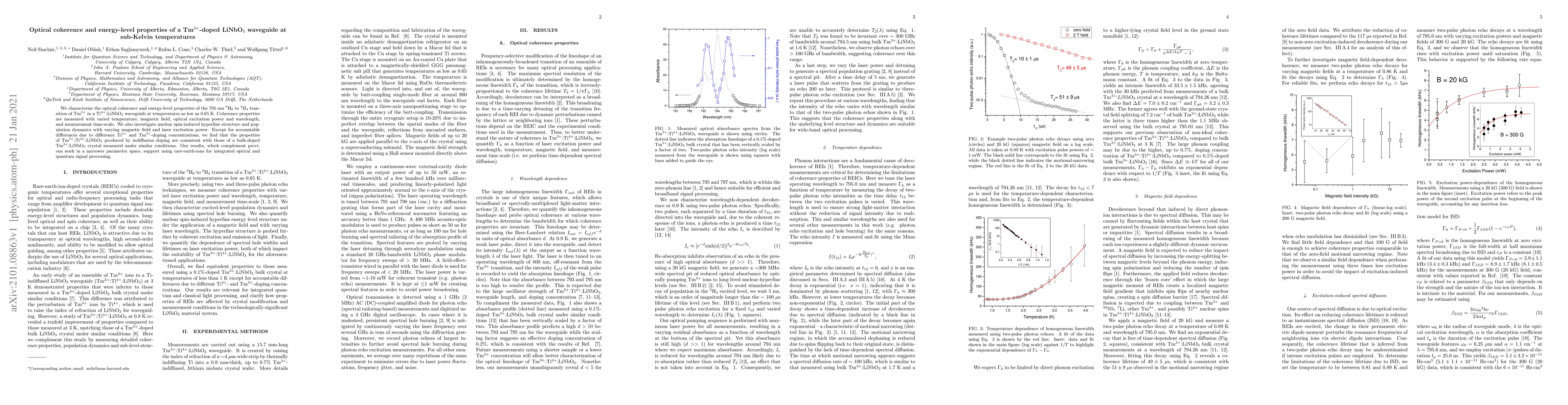 We characterize the optical coherence and energy-level properties of the 795 nm $^3$H$_6$ to $^3$H$_4$ transition of Tm$^{3+}$ in a Ti$^{4+}$:LiNbO$_{3}$ waveguide at temperatures as low as 0.65 K. Coherence properties are measured with varied temperature, magnetic field, optical excitation power and wavelength, and measurement time-scale. We also investigate nuclear spin-induced hyperfine structure and population dynamics with varying magnetic field and laser excitation power. Except for accountable differences due to difference Ti$^{4+}$ and Tm$^{3+}$-doping concentrations, we find that the properties of Tm$^{3+}$:Ti$^{4+}$:LiNbO$_{3}$ produced by indiffusion doping are consistent with those of a bulk-doped Tm$^{3+}$:LiNbO$_{3}$ crystal measured under similar conditions. Our results, which complement previous work in a narrower parameter space, support using rare-earth-ions for integrated optical and quantum signal processing.