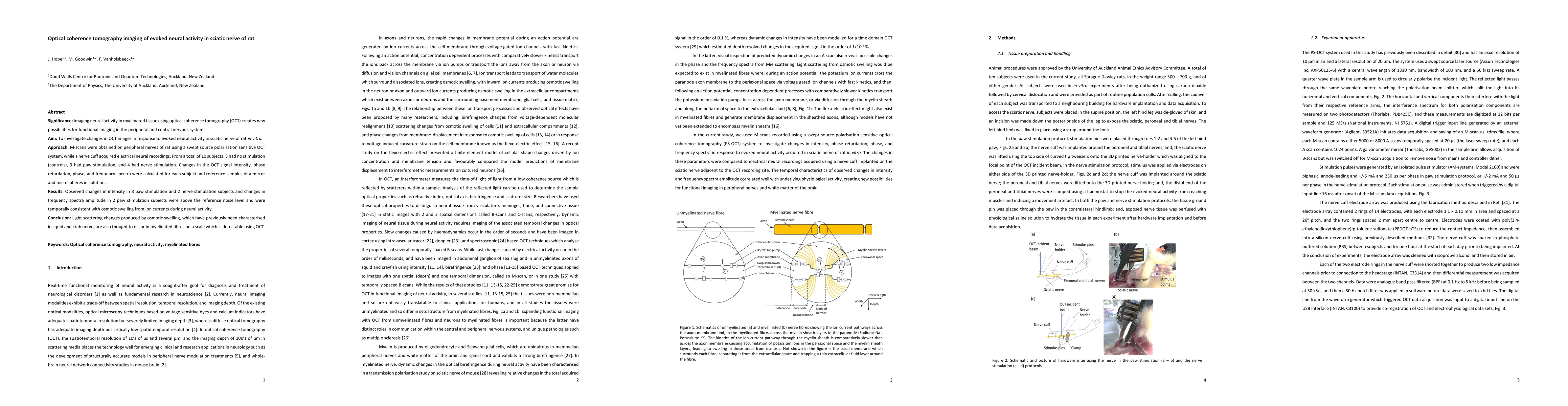 This study investigates changes in optical coherence tomography (OCT) images in response to evoked neural activity in rat sciatic nerves, revealing detectable light scattering changes due to osmotic swelling from ion currents during neural activity. The findings suggest OCT's potential for functional imaging in peripheral nerves.