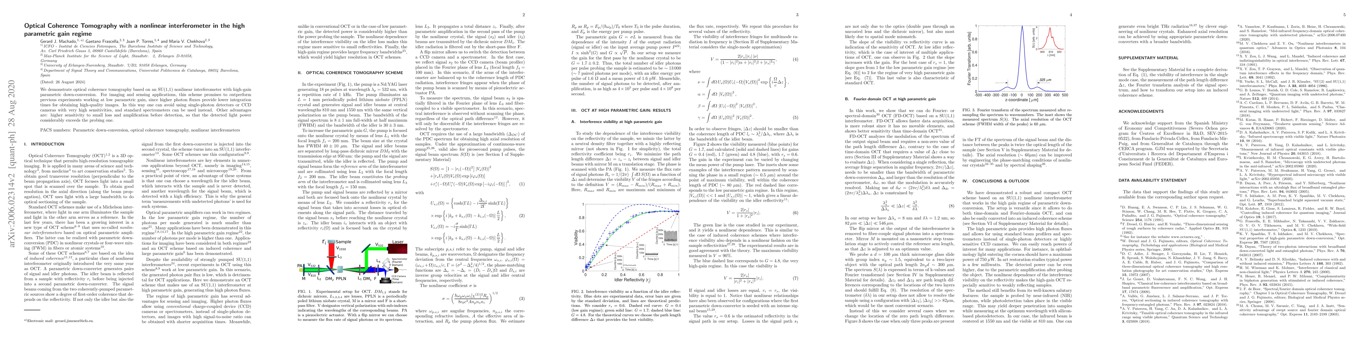We demonstrate optical coherence tomography based on an SU(1,1) nonlinear interferometer with high-gain parametric down-conversion. For imaging and sensing applications, this scheme promises to outperform previous experiments working at low parametric gain, since higher photon fluxes provide lower integration times for obtaining high-quality images. In this way one can avoid using single-photon detectors or CCD cameras with very high sensitivities, and standard spectrometers can be used instead. Other advantages are: higher sensitivity to small loss and amplification before detection, so that the detected light power considerably exceeds the probing one.