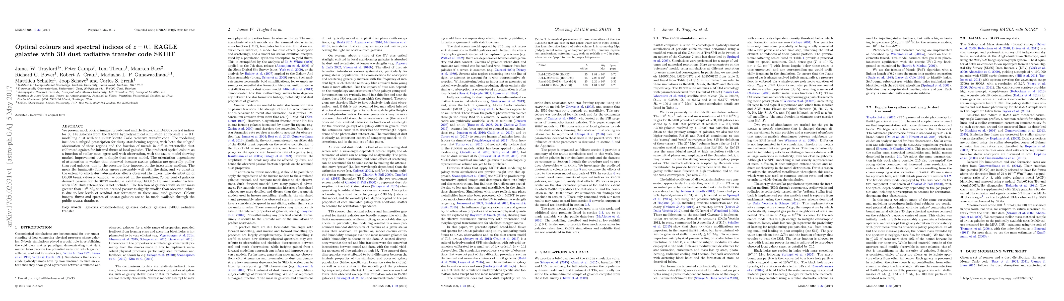 This paper models the optical colours and spectral indices of $z=0.1$ EAGLE galaxies using the SKIRT radiative transfer code, showing improved agreement with observations compared to simpler models. The study highlights the impact of dust obscuration on H$\alpha$ fluxes and the bimodal distribution of D4000 spectral indices, with 20% of passive galaxies reclassified as active without dust attenuation.