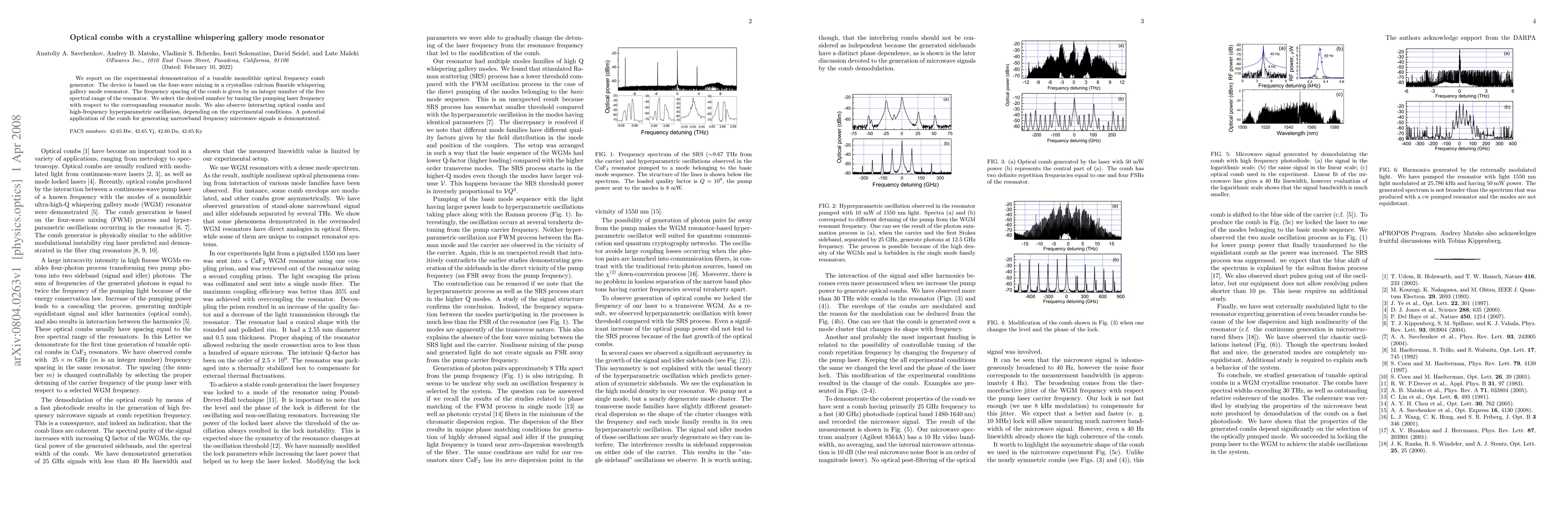 This research demonstrates a tunable optical frequency comb generator using a crystalline calcium fluoride whispering gallery mode resonator, showing the generation of narrowband microwave signals with precise control over frequency spacing through laser tuning. The study also investigates interacting optical combs and high-frequency hyperparametric oscillation under different experimental conditions.