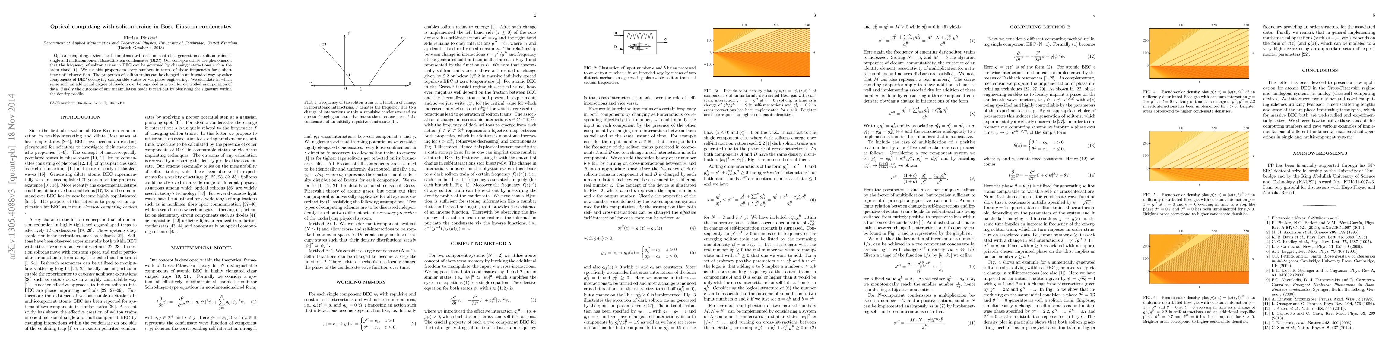 This paper proposes an optical computing framework based on soliton trains in Bose-Einstein condensates (BEC), where soliton frequency changes govern data storage and manipulation. The authors demonstrate how interactions within the atom cloud can control these frequencies and suggest a method for reading out manipulated data via the density profile.