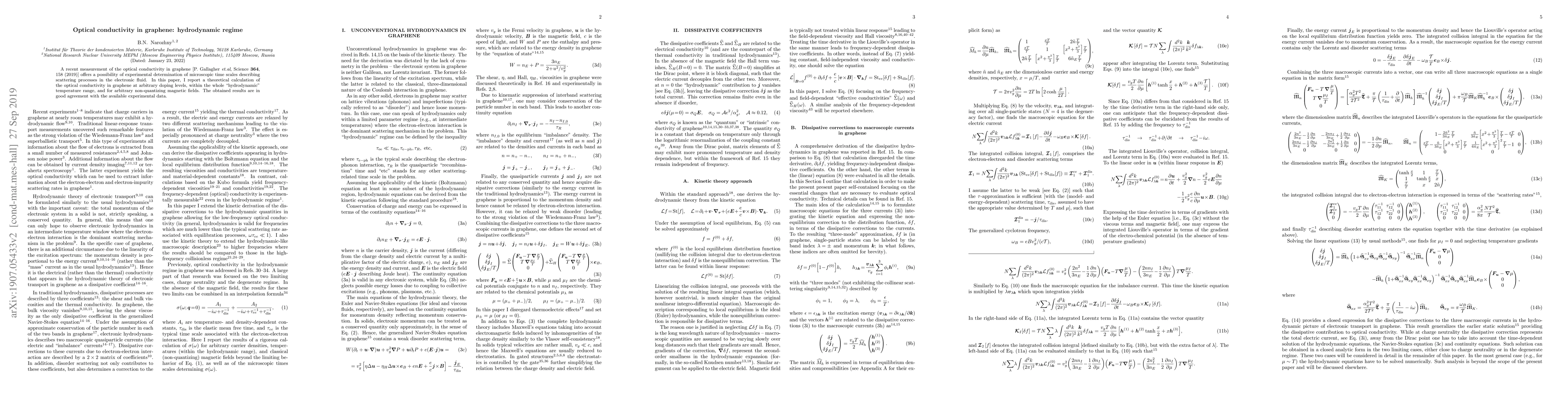 Experimental investigation of hydrodynamics in electron fluids is a highly topical research area that emerged during the last few years. A recent measurement of the optical conductivity in graphene [P. Gallagher et.al, Science 364, 158 (2019)] offers a possibility of experimental determination of microscopic time scales describing scattering processes in the electronic fluid. In this paper, I report a theoretical calculation of the optical conductivity in graphene at arbitrary doping levels, within the whole "hydrodynamic" temperature range, and for arbitrary, non-quantizing magnetic fields. The obtained results are in good agreement with the available experimental data.