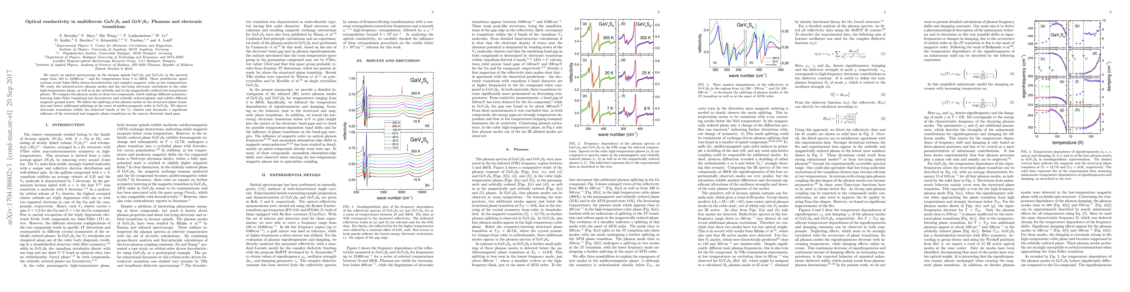 We report on optical spectroscopy on the lacunar spinels GaV$_4$S$_8$ and GeV$_4$S$_8$ in the spectral range from 100 to 23000 cm$^{-1}$ and for temperatures from 5 to 300 K. These multiferroic spinel systems reveal Jahn-Teller driven ferroelectricity and complex magnetic order at low temperatures. We study the infrared-active phonon modes and the low-lying electronic excitations in the cubic high-temperature phase, as well as in the orbitally and in the magnetically ordered low-temperature phases. We compare the phonon modes in these two compounds, which undergo different symmetry-lowering Jahn-Teller transitions into ferroelectric and orbitally ordered phases, and exhibit different magnetic ground states. We follow the splitting of the phonon modes at the structural phase transition and detect additional splittings at the onset of antiferromagnetic order in GeV$_4$S$_8$. We observe electronic transitions within the $d$-derived bands of the V$_4$ clusters and document a significant influence of the structural and magnetic phase transitions on the narrow electronic band gaps.