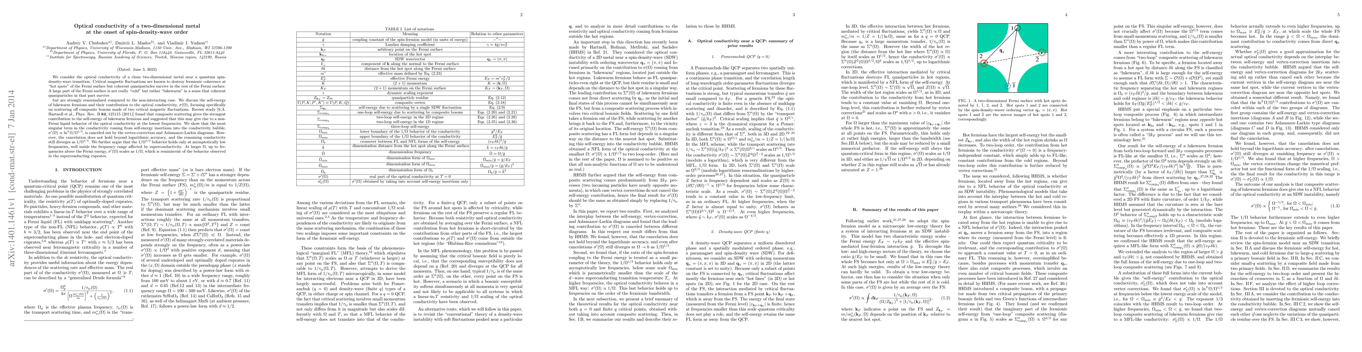 Researchers studied the optical conductivity of a 2D metal near its quantum spin-density-wave transition, finding that coherent quasiparticles survive but are strongly renormalized, leading to a $1/ ilde{ au}^{1/3}$ behavior at low frequencies.
