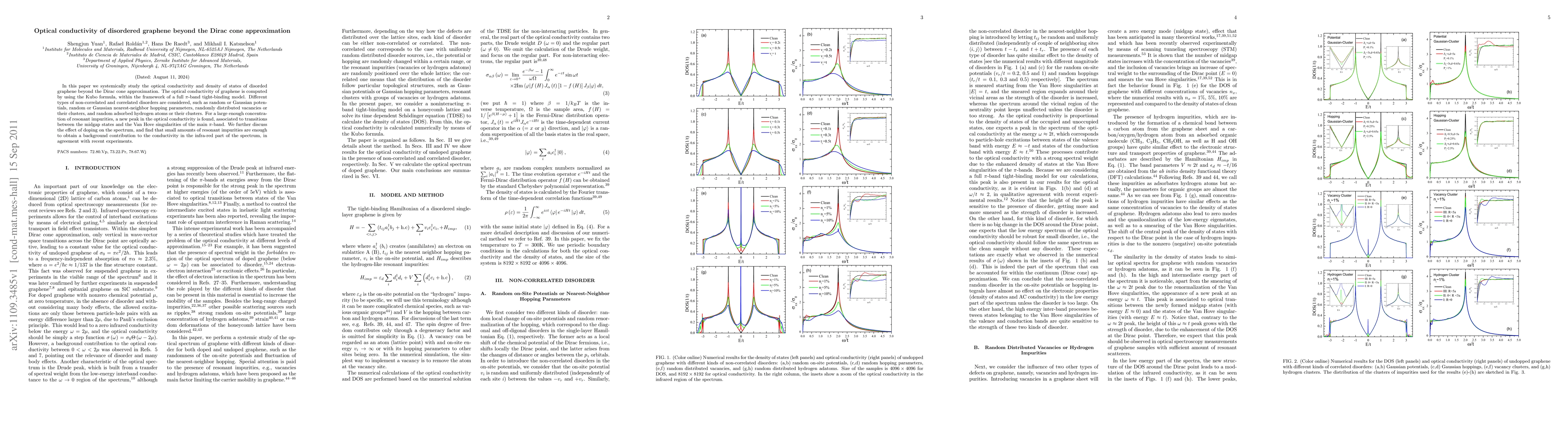 In this paper we systemically study the optical conductivity and density of states of disorded graphene beyond the Dirac cone approximation. The optical conductivity of graphene is computed by using the Kubo formula, within the framework of a full \pi-band tight-binding model. Different types of non-correlated and correlated disorders are considered, such as random or Gaussian potentials, random or Gaussian nearest-neighbor hopping parameters, randomly distributed vacancies or their clusters, and random adsorbed hydrogen atoms or their clusters. For a large enough concentration of resonant impurities, a new peak in the optical conductivity is found, associated to transitions between the midgap states and the Van Hove singularities of the main \pi-band. We further discuss the effect of doping on the spectrum, and find that small amounts of resonant impurities are enough to obtain a background contribution to the conductivity in the infra-red part of the spectrum, in agreement with recent experiments.