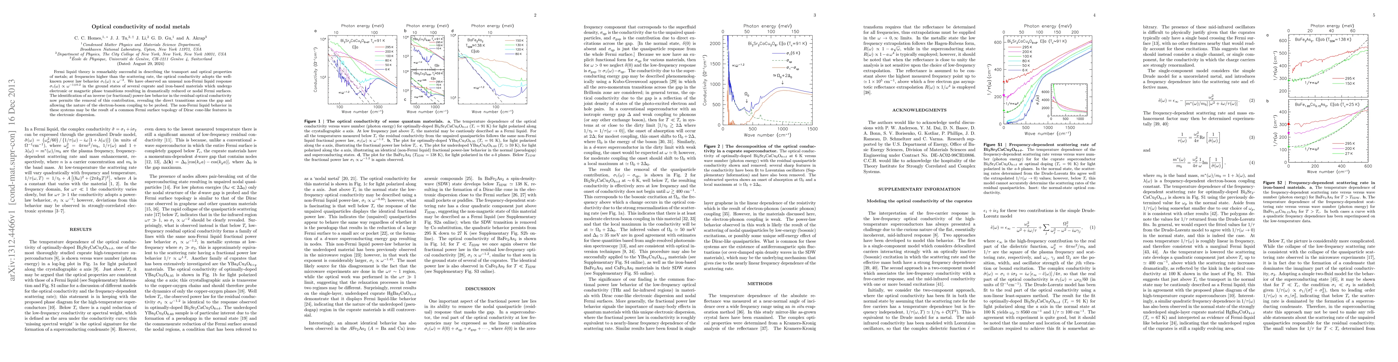 This paper investigates the optical conductivity of nodal metals, revealing an unusual non-Fermi liquid response characterized by an inverse power-law behavior $\sigma_1(\omega) \propto \omega^{-1\pm 0.2}$ in cuprate and iron-based materials. This behavior allows for the probing of electron-boson coupling and suggests a common Fermi surface topology with Dirac cone-like features.