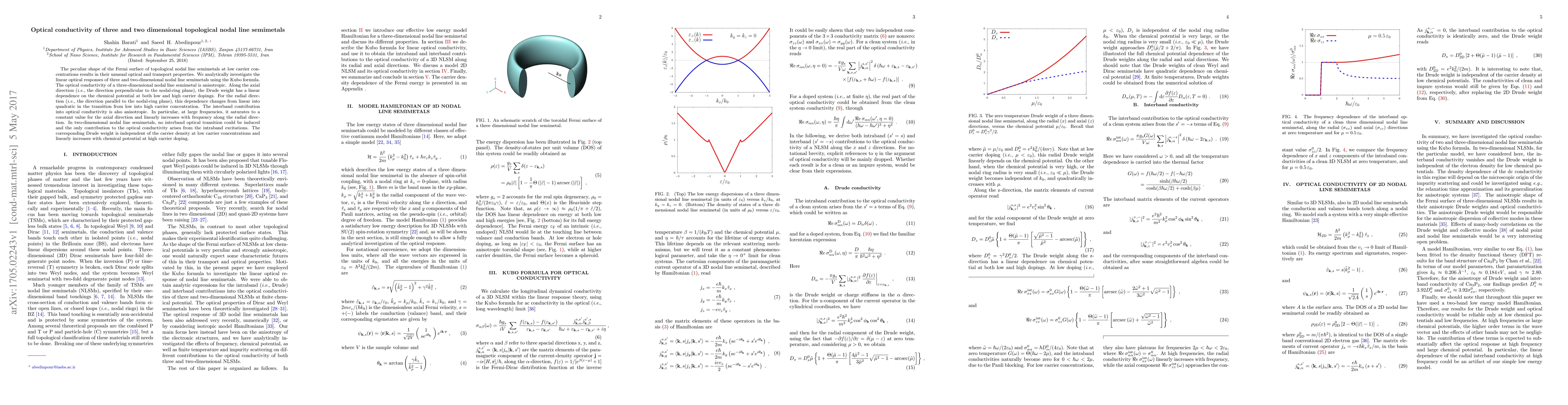 The peculiar shape of the Fermi surface of topological nodal line semimetals at low carrier concentrations results in their unusual optical and transport properties. We analytically investigate the linear optical responses of three and two-dimensional nodal line semimetals using the Kubo formula. The optical conductivity of a three-dimensional nodal line semimetal is anisotropic. Along the axial direction (\textit{i.e.}, the direction perpendicular to the nodal-ring plane), the Drude weight has a linear dependence on the chemical potential at both low and high carrier dopings. For the radial direction (\textit{i.e.}, the direction parallel to the nodal-ring plane), this dependence changes from linear into quadratic in the transition from low into high carrier concentration. The interband contribution into optical conductivity is also anisotropic. In particular, at large frequencies, it saturates to a constant value for the axial direction and linearly increases with frequency along the radial direction. In two-dimensional nodal line semimetals, no interband optical transition could be induced and the only contribution to the optical conductivity arises from the intraband excitations. The corresponding Drude weight is independent of the carrier density at low carrier concentrations and linearly increases with chemical potential at high carrier doping.