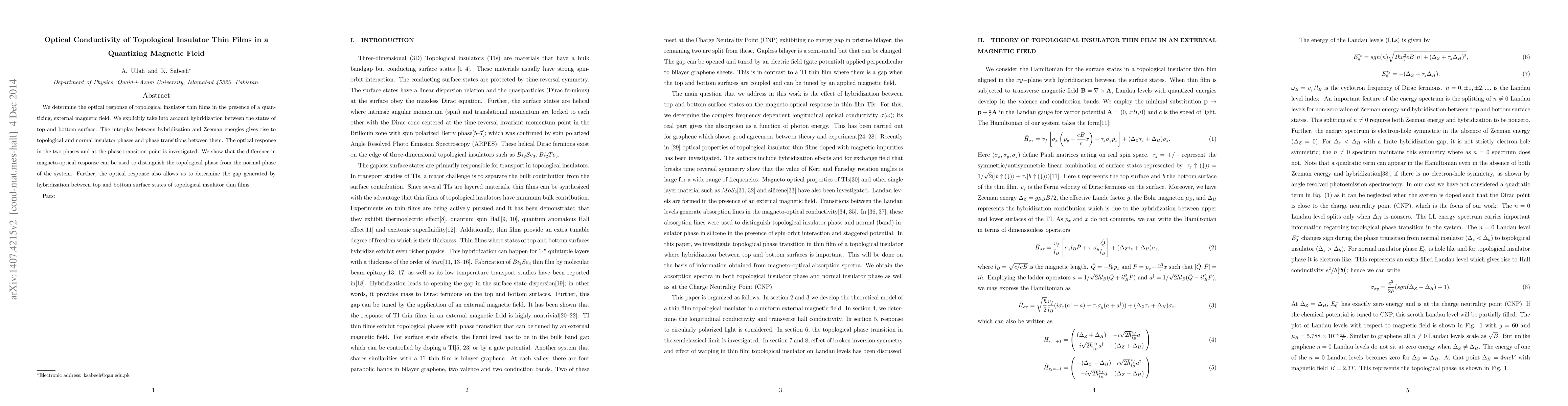 This study investigates the optical conductivity of topological insulator thin films under a quantizing magnetic field, revealing distinct magneto-optical responses for topological and normal insulator phases. The findings indicate that optical measurements can distinguish between these phases and determine the gap from surface state hybridization.