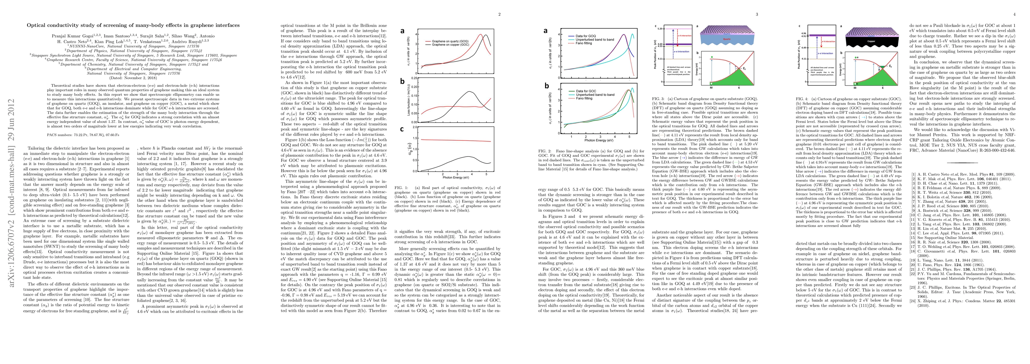 This study uses spectroscopic ellipsometry to quantify electron-electron and electron-hole interactions in graphene interfaces, revealing strong many-body effects in graphene on quartz and weak screening in graphene on copper, with the effective fine structure constant $\alpha_{g}^{*}$ showing significant differences between the two systems.