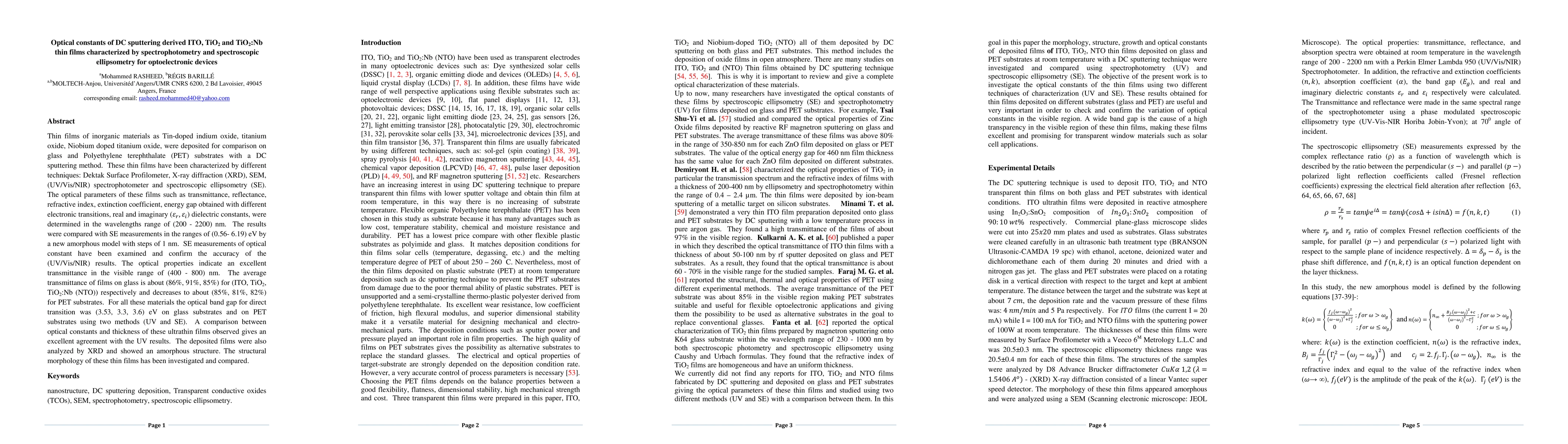 This paper investigates the optical constants of DC sputtered ITO, TiO2, and TiO2:Nb thin films on glass and PET substrates using spectrophotometry and spectroscopic ellipsometry. The films exhibit high transmittance in the visible range and amorphous structures, with optical band gaps determined by both UV and SE methods.