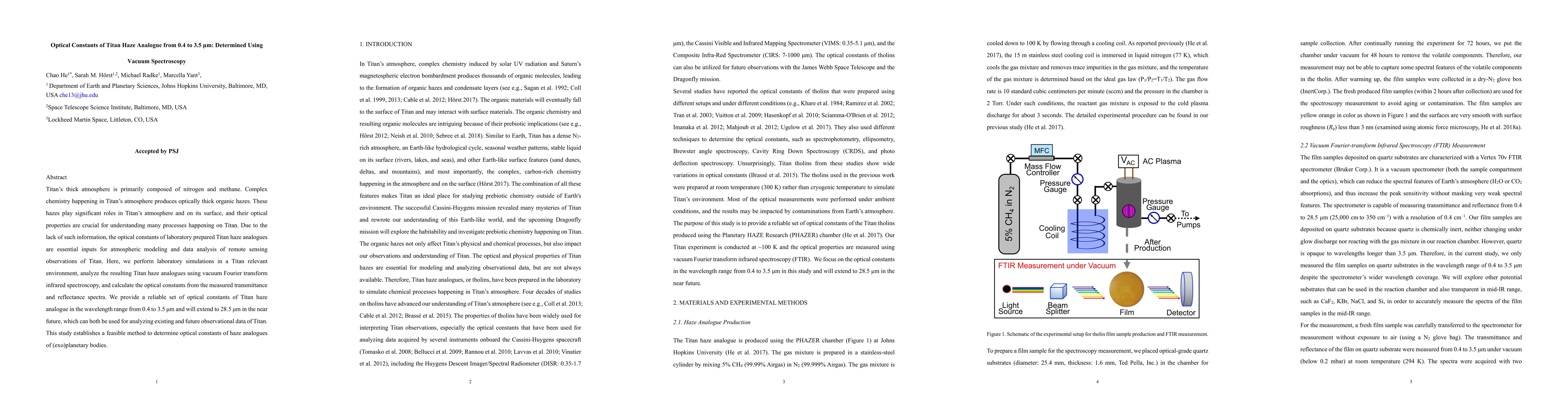 Titan's thick atmosphere is primarily composed of nitrogen and methane. Complex chemistry happening in Titan's atmosphere produces optically thick organic hazes. These hazes play significant roles in Titan's atmosphere and on its surface, and their optical properties are crucial for understanding many processes happening on Titan. Due to the lack of such information, the optical constants of laboratory prepared Titan haze analogues are essential inputs for atmospheric modeling and data analysis of remote sensing observations of Titan. Here, we perform laboratory simulations in a Titan relevant environment, analyze the resulting Titan haze analogues using vacuum Fourier transform infrared spectroscopy, and calculate the optical constants from the measured transmittance and reflectance spectra. We provide a reliable set of optical constants of Titan haze analogue in the wavelength range from 0.4 to 3.5 micron and will extend to 28.5 micron in the near future, which can both be used for analyzing existing and future observational data of Titan. This study establishes a feasible method to determine optical constants of haze analogues of (exo)planetary bodies.