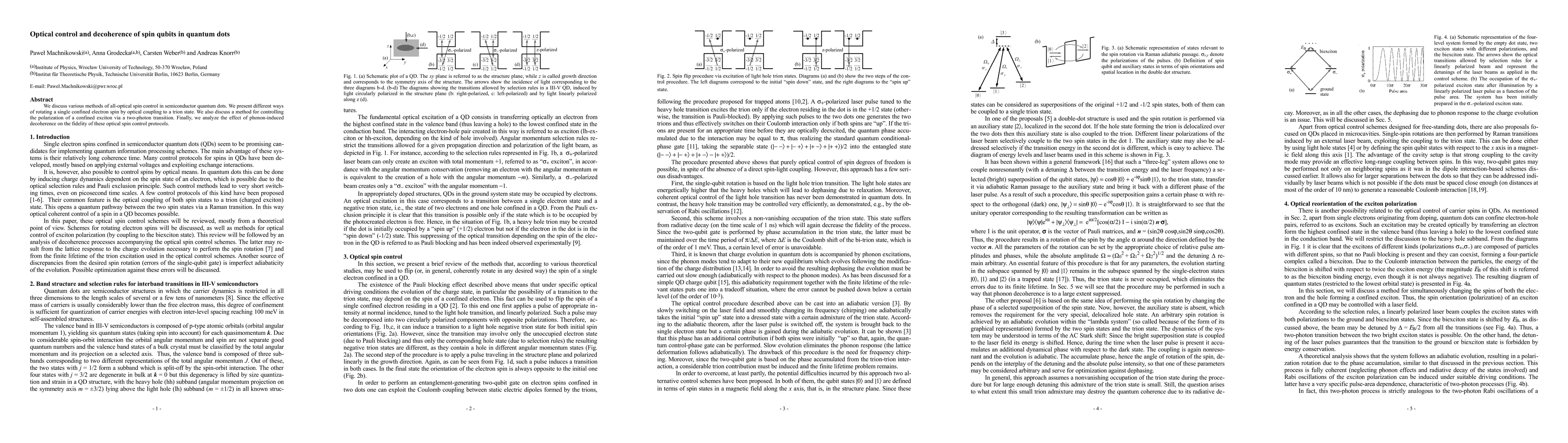 This paper explores all-optical techniques for controlling spin qubits in semiconductor quantum dots, including methods for rotating electron spin via optical coupling to a trion state and controlling exciton polarization through a two-photon transition. It also examines the impact of phonon-induced decoherence on the fidelity of these optical spin control protocols.