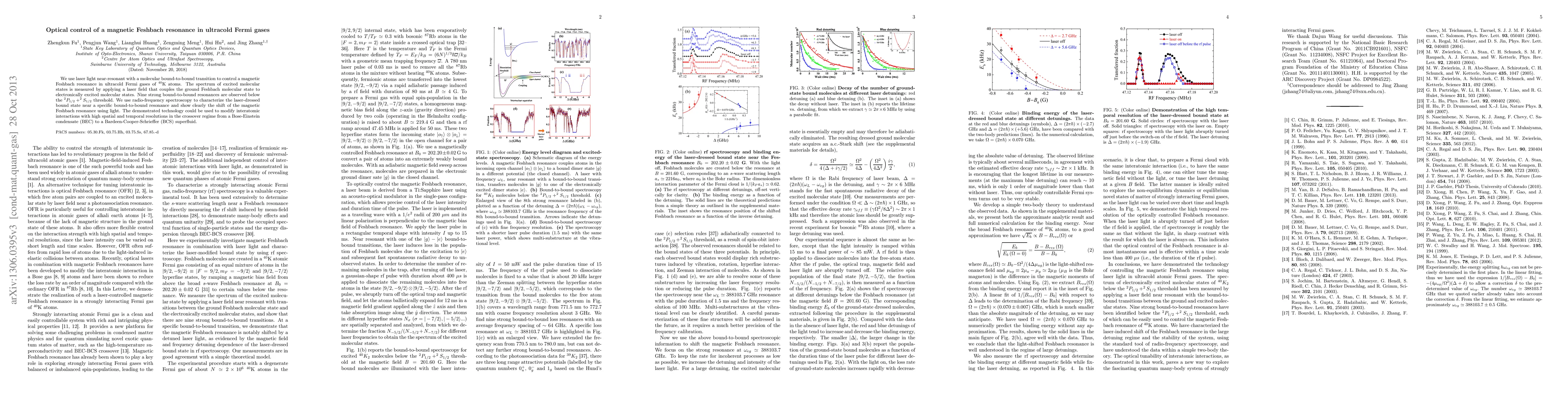 This paper demonstrates optical control of a magnetic Feshbach resonance in ultracold Fermi gases of $^{40}$K atoms using laser light, observing nine strong resonances and shifting the resonance with negligible atomic loss, potentially enabling precise interaction modifications in the crossover regime.