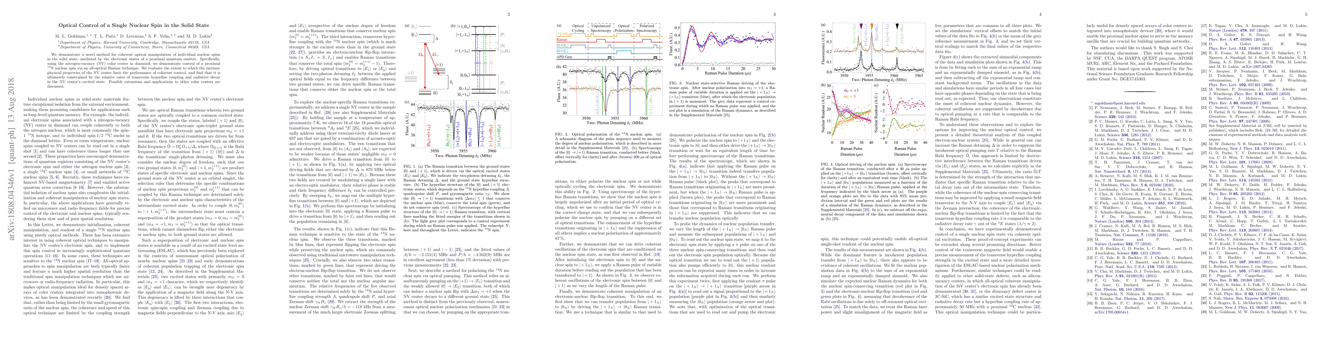 We demonstrate a novel method for coherent optical manipulation of individual nuclear spins in the solid state, mediated by the electronic states of a proximal quantum emitter. Specifically, using the nitrogen-vacancy (NV) color center in diamond, we demonstrate control of a proximal $^{14}$N nuclear spin via an all-optical Raman technique. We evaluate the extent to which the intrinsic physical properties of the NV center limit the performance of coherent control, and find that it is ultimately constrained by the relative rates of transverse hyperfine coupling and radiative decay in the NV center's excited state. Possible extensions and applications to other color centers are discussed.