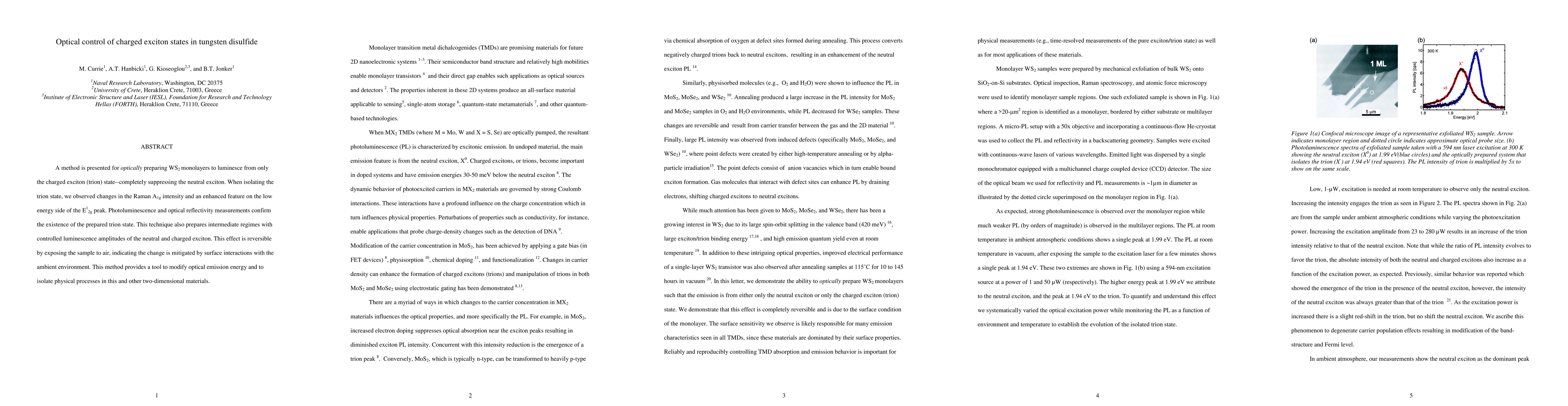 This research presents a method to optically prepare WS2 monolayers to luminesce exclusively from charged exciton states, suppressing neutral exciton luminescence. The technique involves changes in Raman intensity and enhanced photoluminescence features, confirming the existence of the trion state and allowing reversible modulation of exciton states by air exposure.