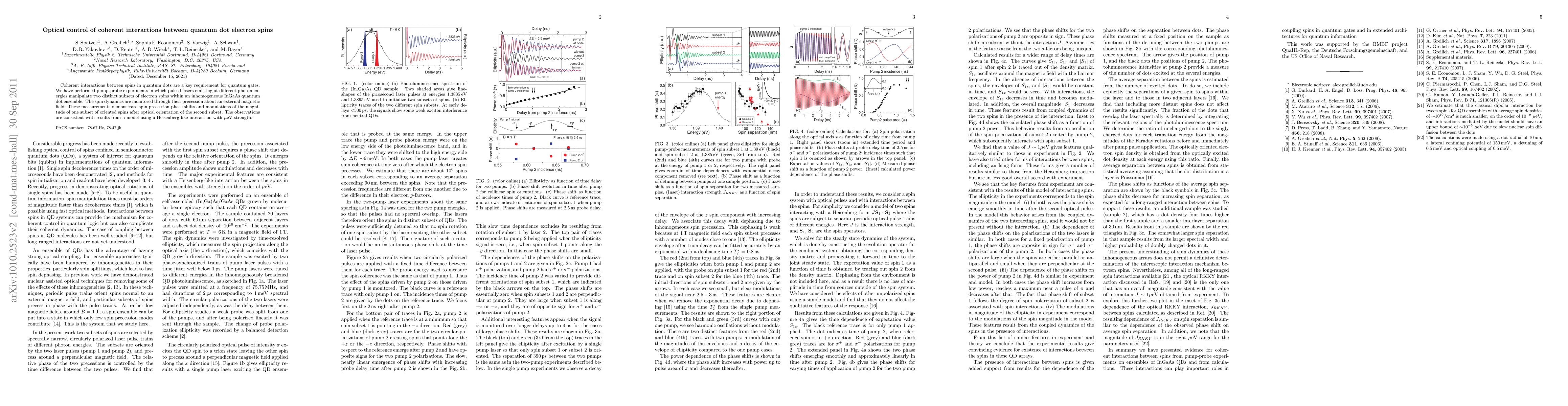 This research demonstrates optical manipulation of coherent interactions between electron spins in quantum dots, using pump-probe experiments to control spin dynamics and achieve phase shifts and modulations, consistent with a Heisenberg-like interaction model.