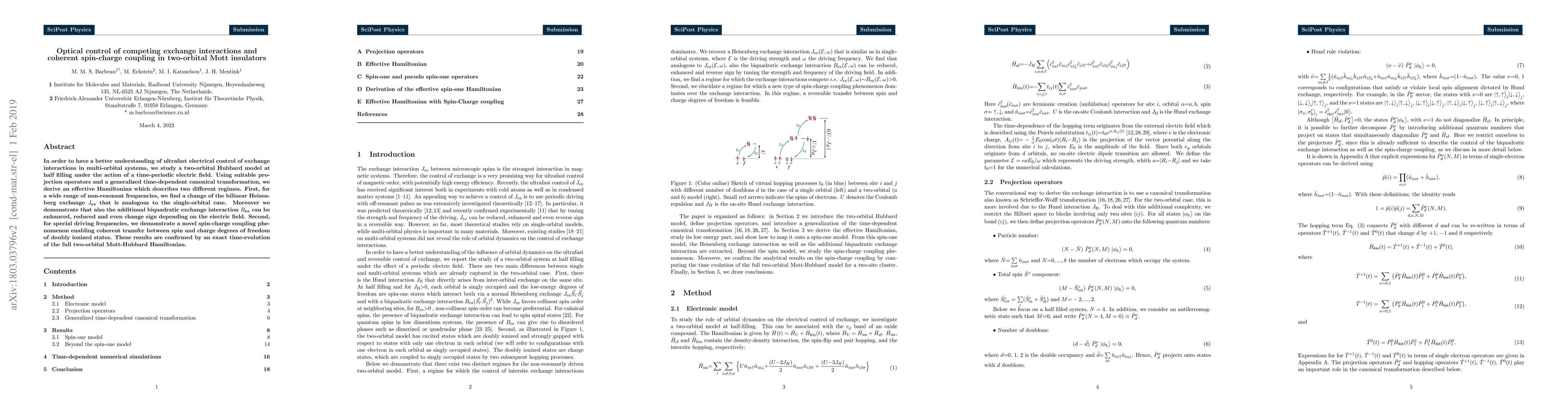 This paper investigates the optical manipulation of exchange interactions in a two-orbital Mott insulator using a time-periodic electric field. It reveals changes in both bilinear and biquadratic exchange interactions and introduces a novel spin-charge coupling phenomenon at specific frequencies.