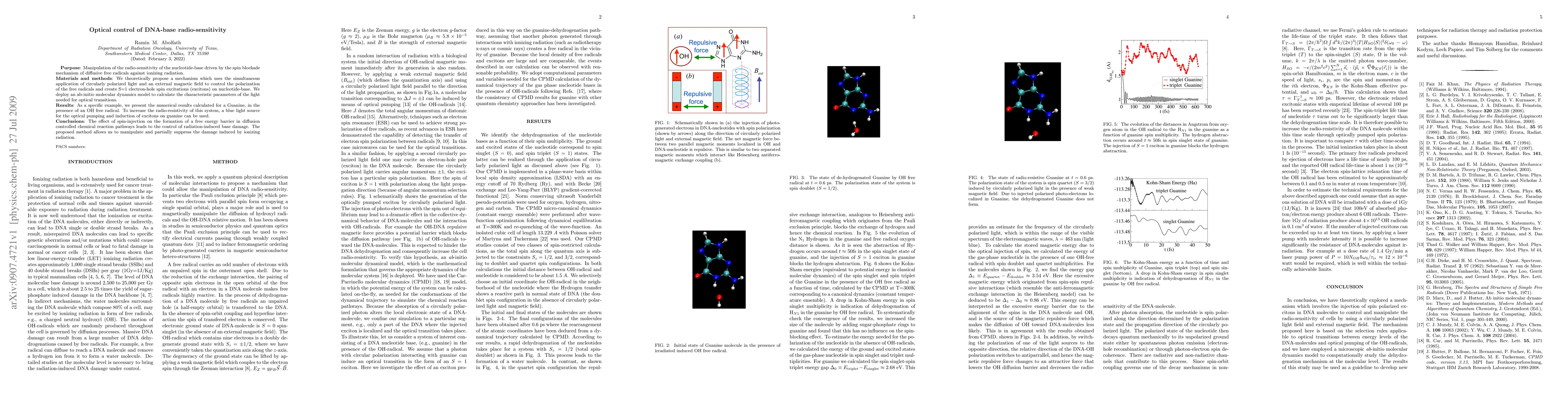 {\bf Purpose}: Manipulation of the radio-sensitivity of the nucleotide-base driven by the spin blockade mechanism of diffusive free radicals against ionizing radiation. {\bf Materials and methods}: We theoretically propose a mechanism which uses the simultaneous application of circularly polarized light and an external magnetic field to control the polarization of the free radicals and create S=1 electron-hole spin excitations (excitons) on nucleotide-base. We deploy an ab-initio molecular dynamics model to calculate the characteristic parameters of the light needed for optical transitions. {\bf Results}: As a specific example, we present the numerical results calculated for a Guanine, in the presence of an OH free radical. To increase the radio-resistivity of this system, a blue light source for the optical pumping and induction of excitons on guanine can be used. {\bf Conclusions}: The effect of spin-injection on the formation of a free energy barrier in diffusion controlled chemical reaction pathways leads to the control of radiation-induced base damage. The proposed method allows us to manipulate and partially suppress the damage induced by ionizing radiation.