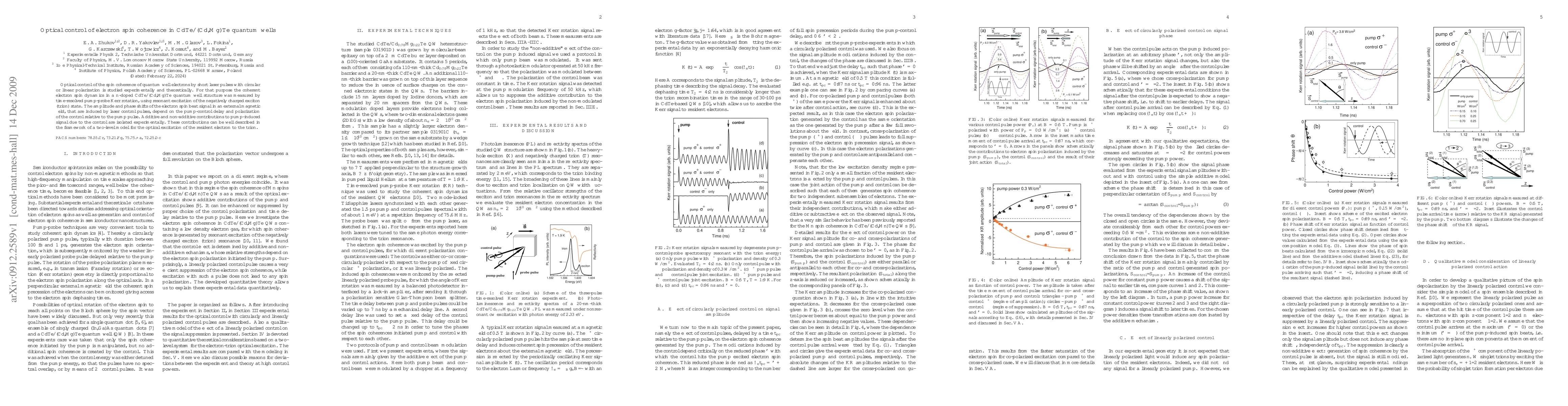This paper investigates the optical manipulation of electron spin coherence in CdTe/(Cd,Mg)Te quantum wells using short laser pulses. Experimental and theoretical analyses reveal that the amplitude and phase shifts of the spin beat signal, induced by control pulses, are influenced by the delay and polarization relative to the pump pulse, with contributions described by a two-level model for exciton excitation.