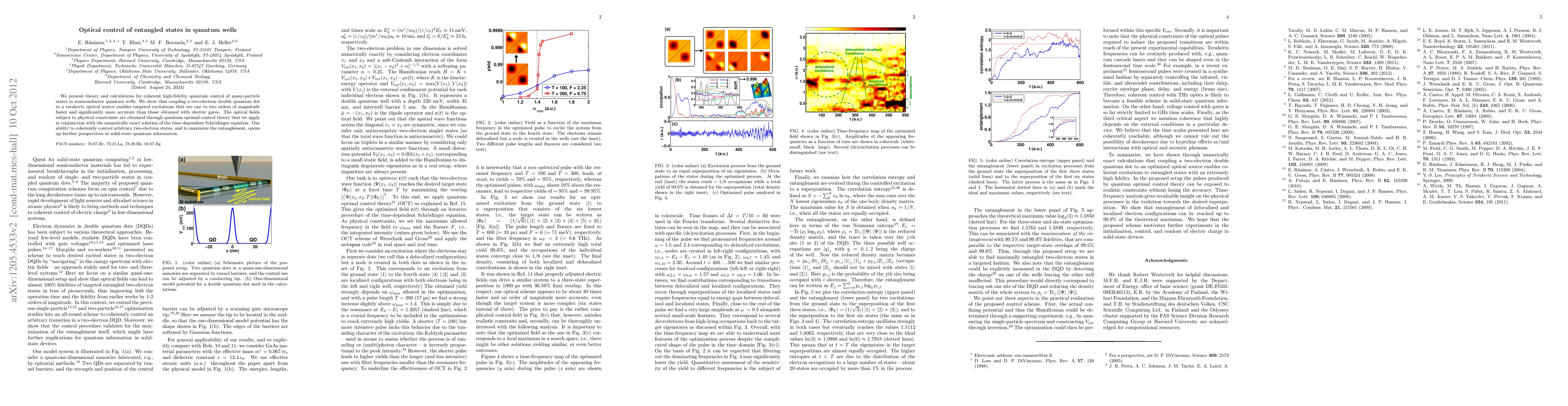 We present theory and calculations for coherent high-fidelity quantum control of many-particle states in semiconductor quantum wells. We show that coupling a two-electron double quantum dot to a terahertz optical source enables targeted excitations that are one to two orders of magnitude faster and significantly more accurate than those obtained with electric gates. The optical fields subject to physical constraints are obtained through quantum optimal control theory that we apply in conjunction with the numerically exact solution of the time-dependent Schrodinger equation. Our ability to coherently control arbitrary two-electron states, and to maximize the entanglement, opens up further perspectives in solid-state quantum information.