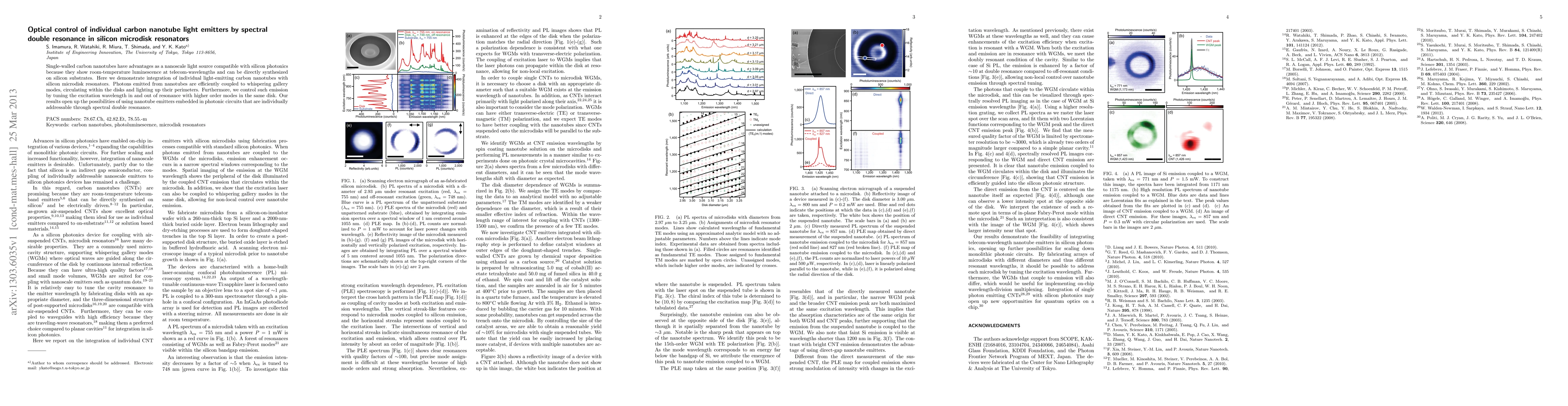 This paper demonstrates the integration of individual carbon nanotube light emitters into silicon microdisk resonators, enabling efficient coupling of nanotube luminescence to disk modes. The researchers control the emission by tuning the excitation wavelength, opening possibilities for addressable nanotube emitters in photonic circuits through spectral double resonance.