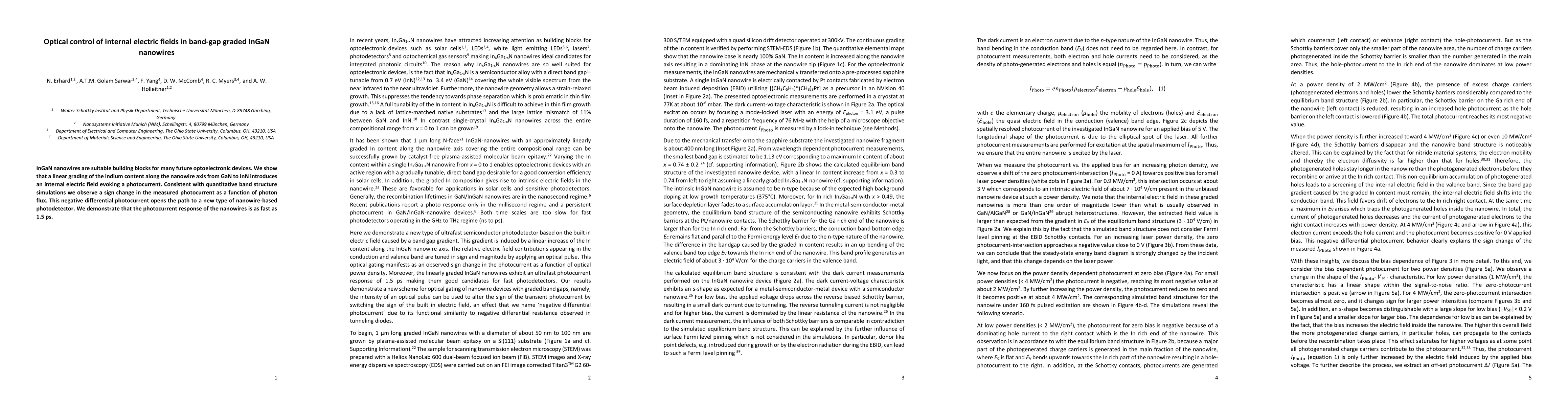The study demonstrates that linear indium content grading in InGaN nanowires creates an internal electric field, leading to a photocurrent that changes sign with photon flux, indicating potential for fast (1.5 ps) nanowire-based photodetectors. This optical control of internal electric fields paves the way for innovative optoelectronic devices.