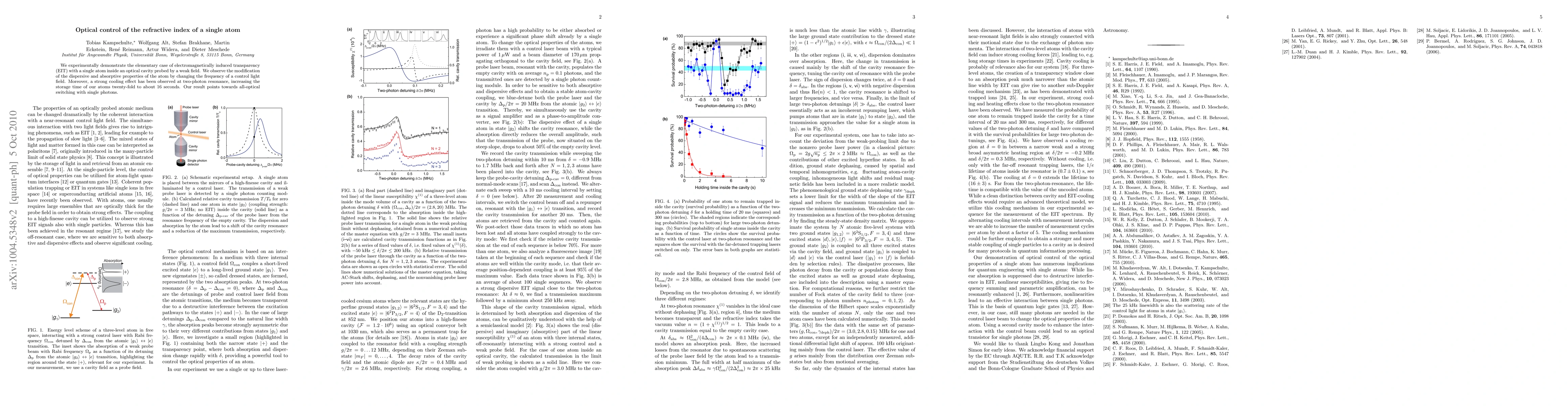 This paper demonstrates electromagnetically induced transparency (EIT) in a single atom within an optical cavity, showing how the atom's refractive index can be optically controlled. The study also reveals a significant cooling effect at two-photon resonance, extending the atom's storage time to 16 seconds.