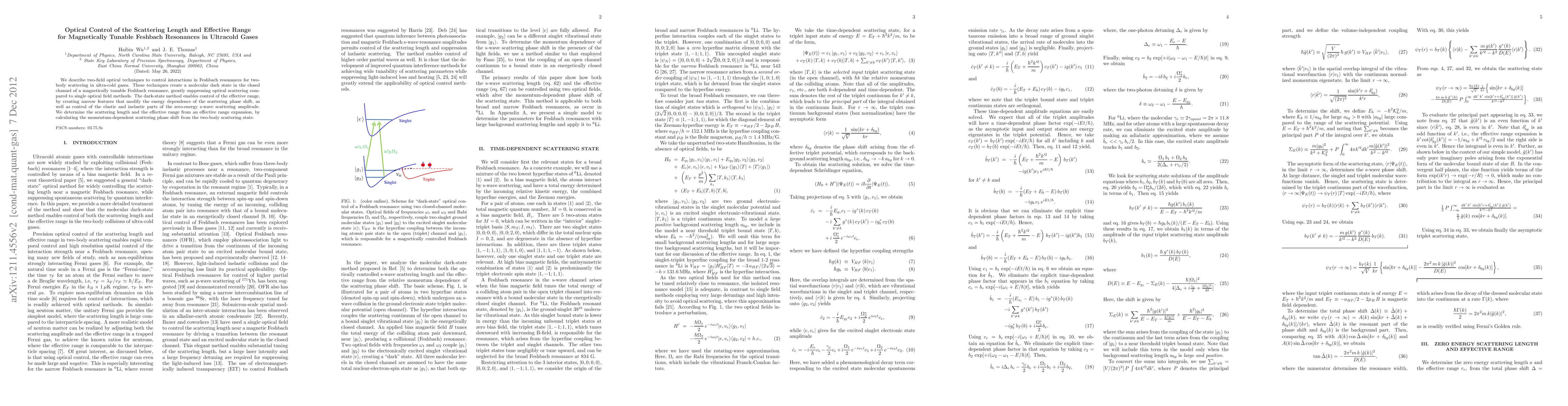 This paper details optical techniques to manipulate interactions in Feshbach resonances for ultracold gases, creating a molecular dark state that suppresses optical scattering and allows precise control over the scattering length and effective range. The method enables fine-tuning of scattering properties through narrow features in the energy dependence of the scattering phase shift.