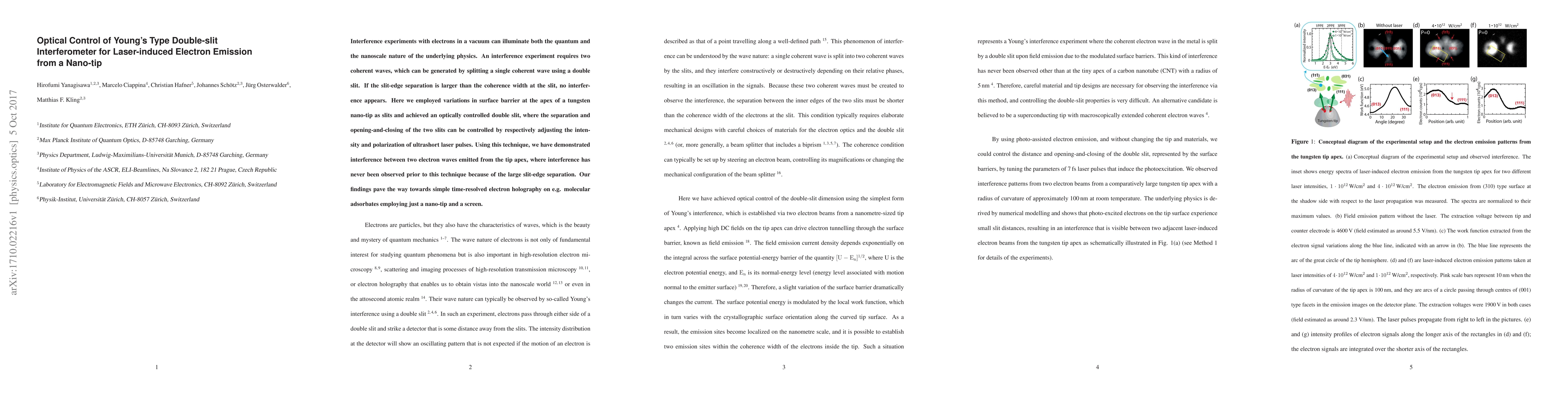 Interference experiments with electrons in a vacuum can illuminate both the quantum and the nanoscale nature of the underlying physics. An interference experiment requires two coherent waves, which can be generated by splitting a single coherent wave using a double slit. If the slit-edge separation is larger than the coherence width at the slit, no interference appears. Here we employed variations in surface barrier at the apex of a tungsten nano-tip as slits and achieved an optically controlled double slit, where the separation and opening-and-closing of the two slits can be controlled by respectively adjusting the intensity and polarization of ultrashort laser pulses. Using this technique, we have demonstrated interference between two electron waves emitted from the tip apex, where interference has never been observed prior to this technique because of the large slit-edge separation. Our findings pave the way towards simple time-resolved electron holography on e.g. molecular adsorbates employing just a nano-tip and a screen.