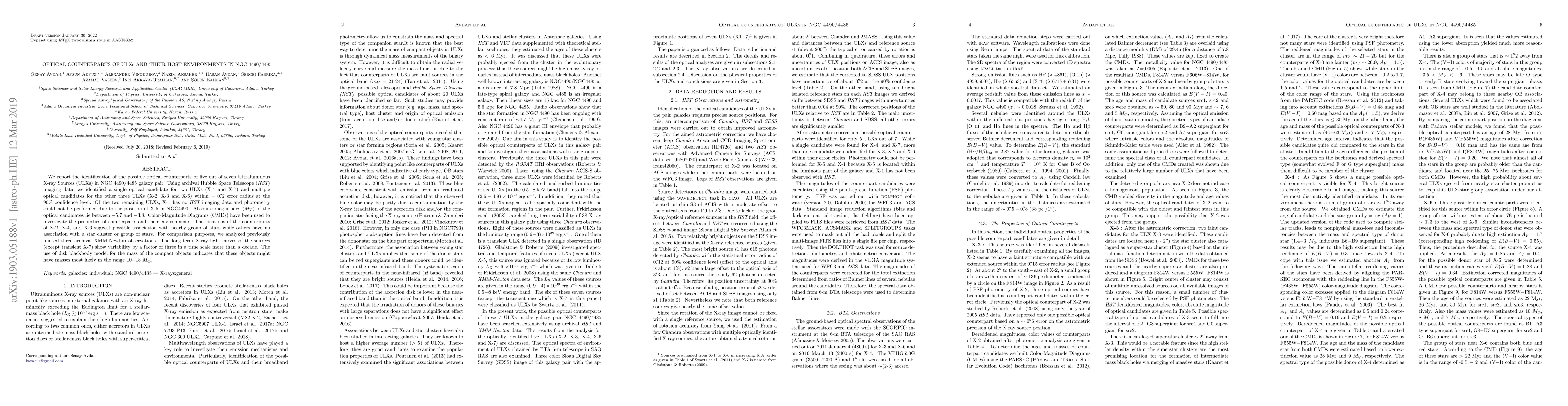 This study identifies possible optical counterparts for five ULXs in NGC 4490/4485 using HST data, with absolute magnitudes suggesting massive objects. X-ray variability and disk blackbody modeling imply compact objects with masses likely between 10-15 $M_{sun}$, while some counterparts show association with nearby star groups.