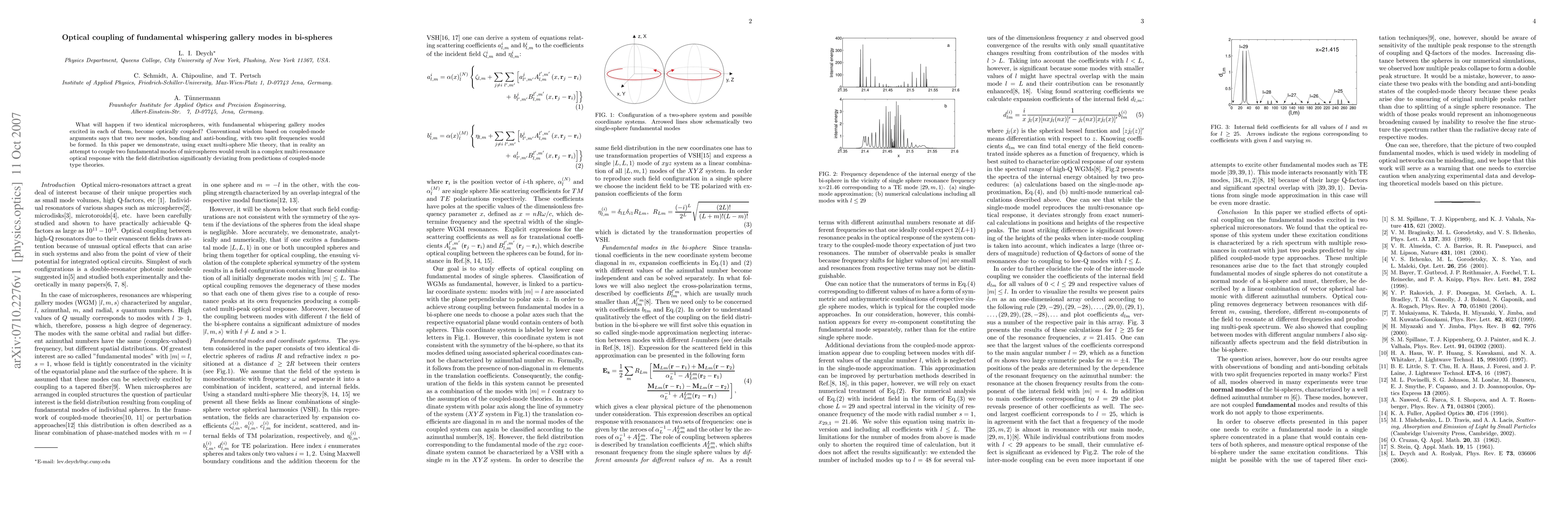 This paper investigates the optical coupling of fundamental whispering gallery modes in two identical bi-spheres, revealing that contrary to coupled-mode theory predictions, the coupling results in a complex multi-resonance optical response with a field distribution significantly deviating from simple bonding and anti-bonding modes.