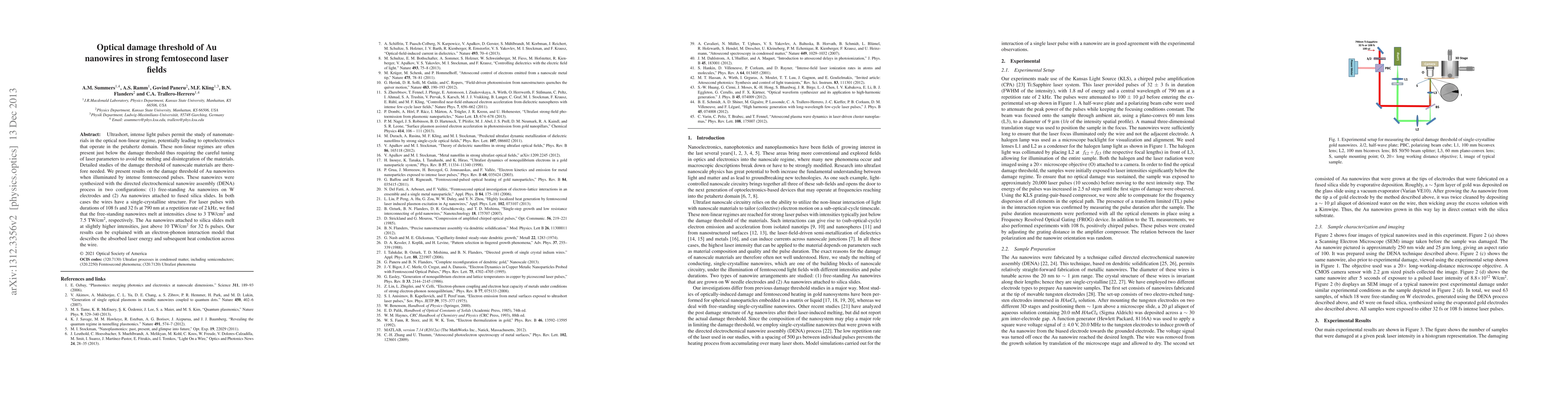 This study investigates the optical damage threshold of Au nanowires under intense femtosecond laser pulses, revealing that free-standing nanowires melt at intensities around 3-7.5 TW/cm², while those attached to silica slides withstand up to 10 TW/cm², with findings explained by an electron-phonon interaction model.
