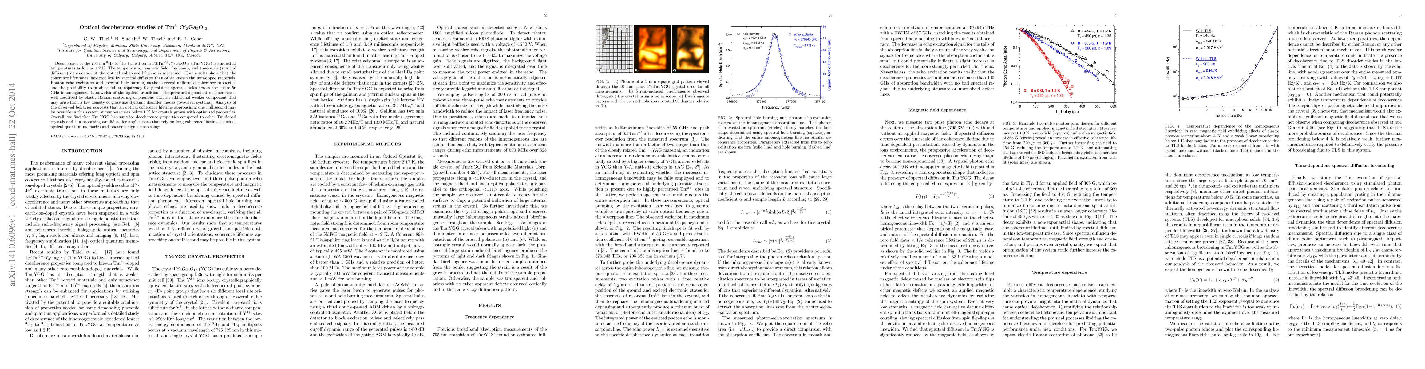 Decoherence of the 795 nm $^3$H$_6$ to $^3$H$_4$ transition in 1%Tm$^{3+}$:Y$_3$Ga$_5$O$_{12}$ (Tm:YGG) is studied at temperatures as low as 1.2 K. The temperature, magnetic field, frequency, and time-scale (spectral diffusion) dependence of the optical coherence lifetime is measured. Our results show that the coherence lifetime is impacted less by spectral diffusion than other known thulium-doped materials. Photon echo excitation and spectral hole burning methods reveal uniform decoherence properties and the possibility to produce full transparency for persistent spectral holes across the entire 56 GHz inhomogeneous bandwidth of the optical transition. Temperature-dependent decoherence is well described by elastic Raman scattering of phonons with an additional weaker component that may arise from a low density of glass-like dynamic disorder modes (two-level systems). Analysis of the observed behavior suggests that an optical coherence lifetime approaching one millisecond may be possible in this system at temperatures below 1 K for crystals grown with optimized properties. Overall, we find that Tm:YGG has superior decoherence properties compared to other Tm-doped crystals and is a promising candidate for applications that rely on long coherence lifetimes, such as optical quantum memories and photonic signal processing.