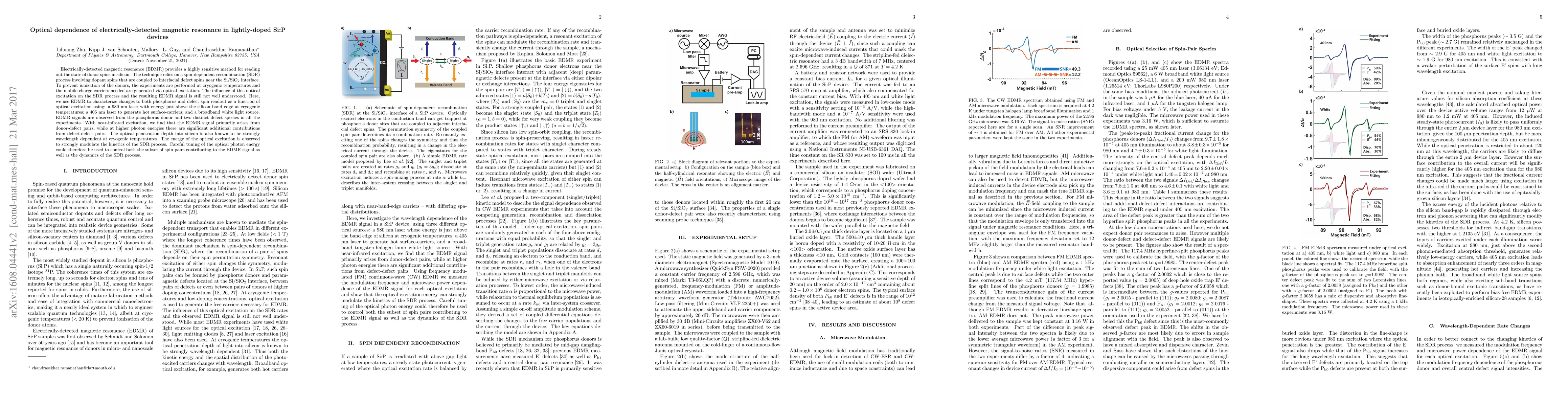 Researchers used EDMR to study how optical excitation affects the state of donor spins in silicon at cryogenic temperatures. They found that the type of light used could control which spin pairs contributed to the signal and even modulated the kinetics of the SDR process.