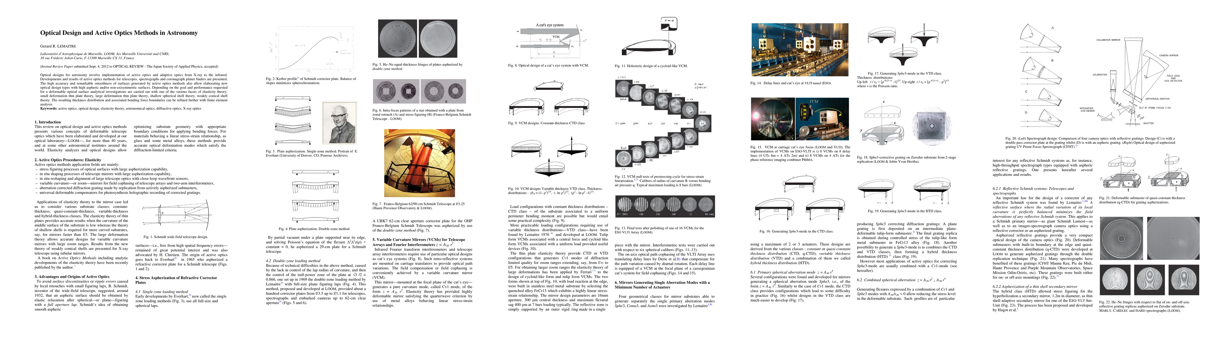 This paper explores the application of active optics methods in astronomical optical designs, from X-ray to infrared, detailing their development and results for telescopes, spectrographs, and planet finders. It also discusses the use of various elasticity theories and finite element analysis to refine the design of high-accuracy, aspheric, and non-axisymmetric surfaces.