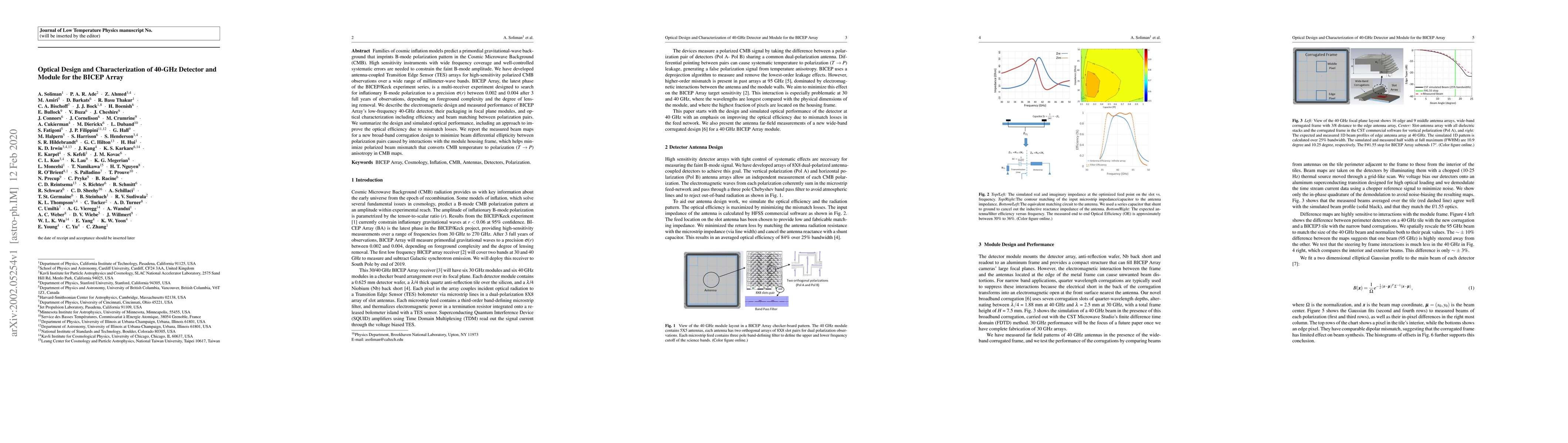 Families of cosmic inflation models predict a primordial gravitational-wave background that imprints B-mode polarization pattern in the Cosmic Microwave Background (CMB). High sensitivity instruments with wide frequency coverage and well-controlled systematic errors are needed to constrain the faint B-mode amplitude. We have developed antenna-coupled Transition Edge Sensor (TES) arrays for high-sensitivity polarized CMB observations over a wide range of millimeter-wave bands. BICEP Array, the latest phase of the BICEP/Keck experiment series, is a multi-receiver experiment designed to search for inflationary B-mode polarization to a precision $\sigma$(r) between 0.002 and 0.004 after 3 full years of observations, depending on foreground complexity and the degree of lensing removal. We describe the electromagnetic design and measured performance of BICEP Array low-frequency 40-GHz detector, their packaging in focal plane modules, and optical characterization including efficiency and beam matching between polarization pairs. We summarize the design and simulated optical performance, including an approach to improve the optical efficiency due to mismatch losses. We report the measured beam maps for a new broad-band corrugation design to minimize beam differential ellipticity between polarization pairs caused by interactions with the module housing frame, which helps minimize polarized beam mismatch that converts CMB temperature to polarization ($T \rightarrow P$) anisotropy in CMB maps.
